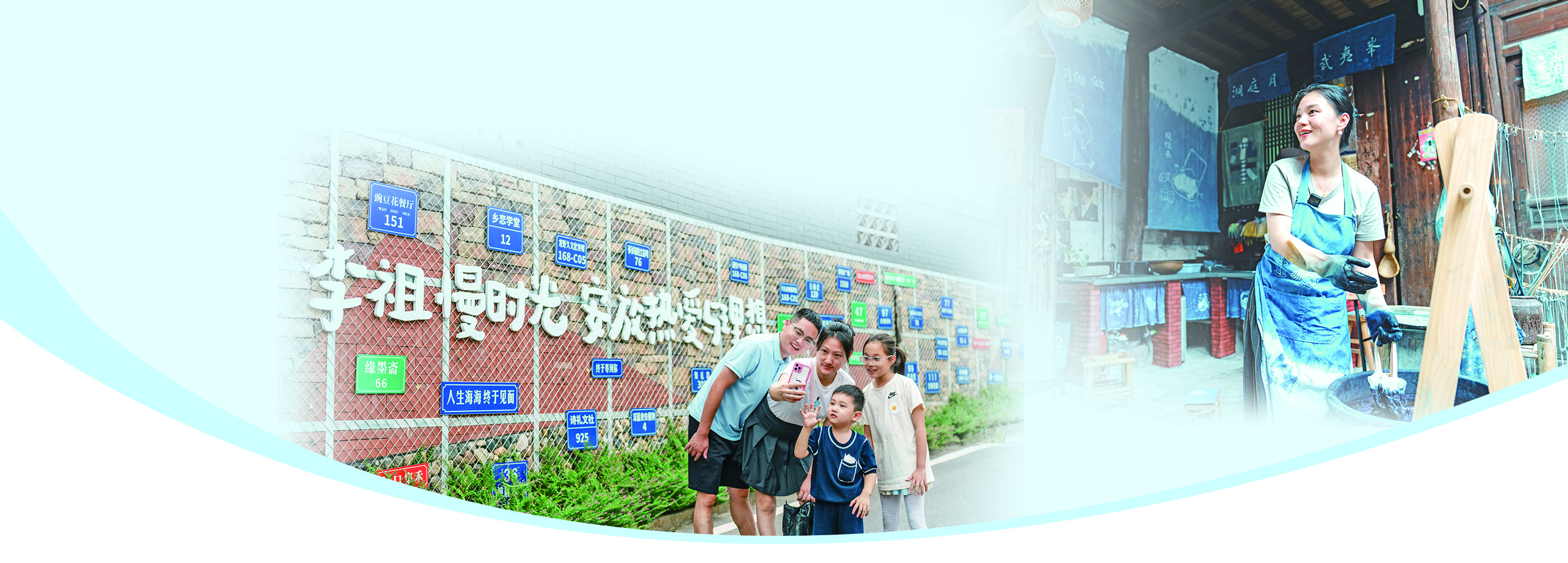 沿着洁净的村道漫步,扎染工作室的蓝印花布随风摇曳,咖啡香气从半开的木门中飘出,手工艺品店内传来年轻人直播的生动讲解……