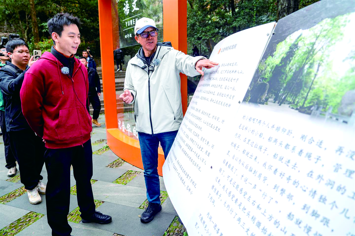 前往双龙洞的途中,俞敏洪被“教科书打卡点”吸引,与主播冬冬一起拍照打卡。冬冬朗读了课文《记金华的双龙洞》,获得一块印有课文的芝士吐司,感叹:“把知识吃进肚子里,太有意思了!”