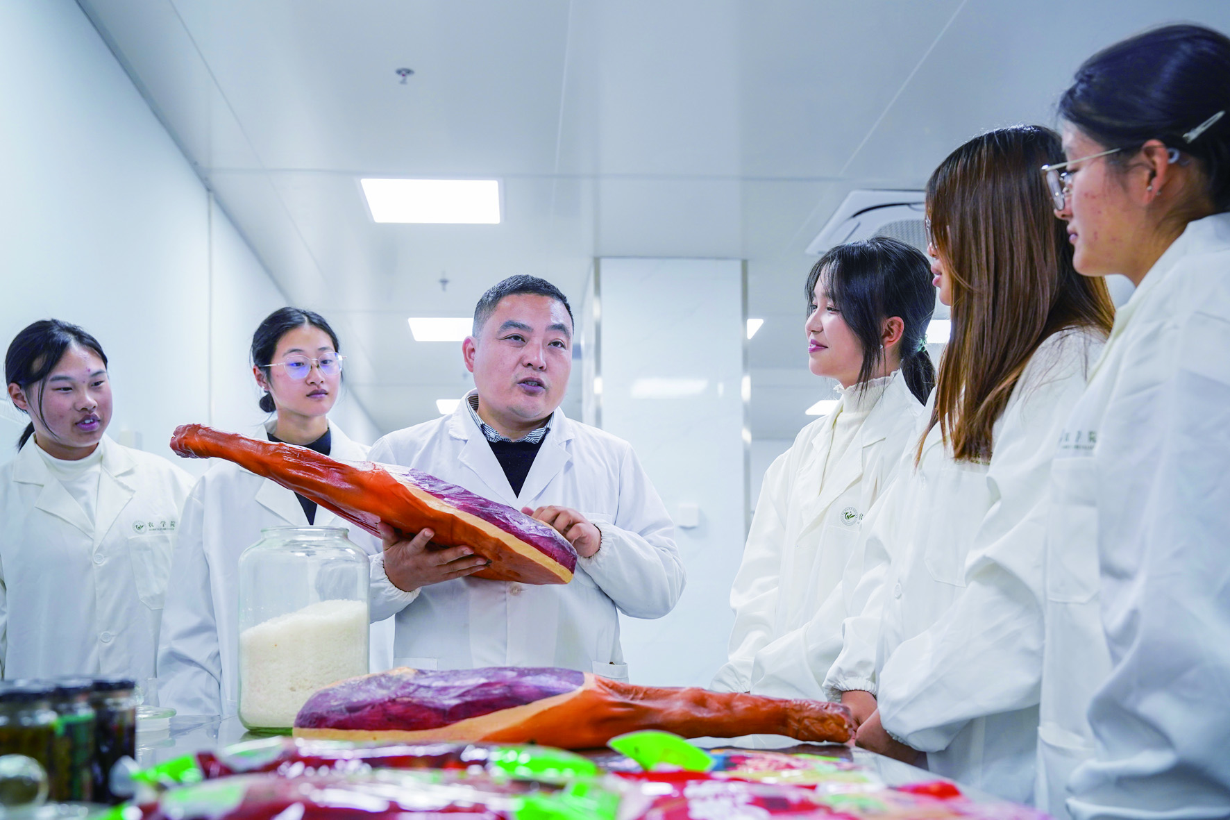 记者 钟路 文/摄 昨日,在金华职业技术大学火腿学院的实验室里,火腿班班主任解华东老师拿着猪腿模型一边讲解一边操作,向学生们传授技艺。 据了解,金华职业技术大学火腿学院2024年挂牌成立,通过师带徒与高校教育相结合的模式为产业培养新生代技能人才。
