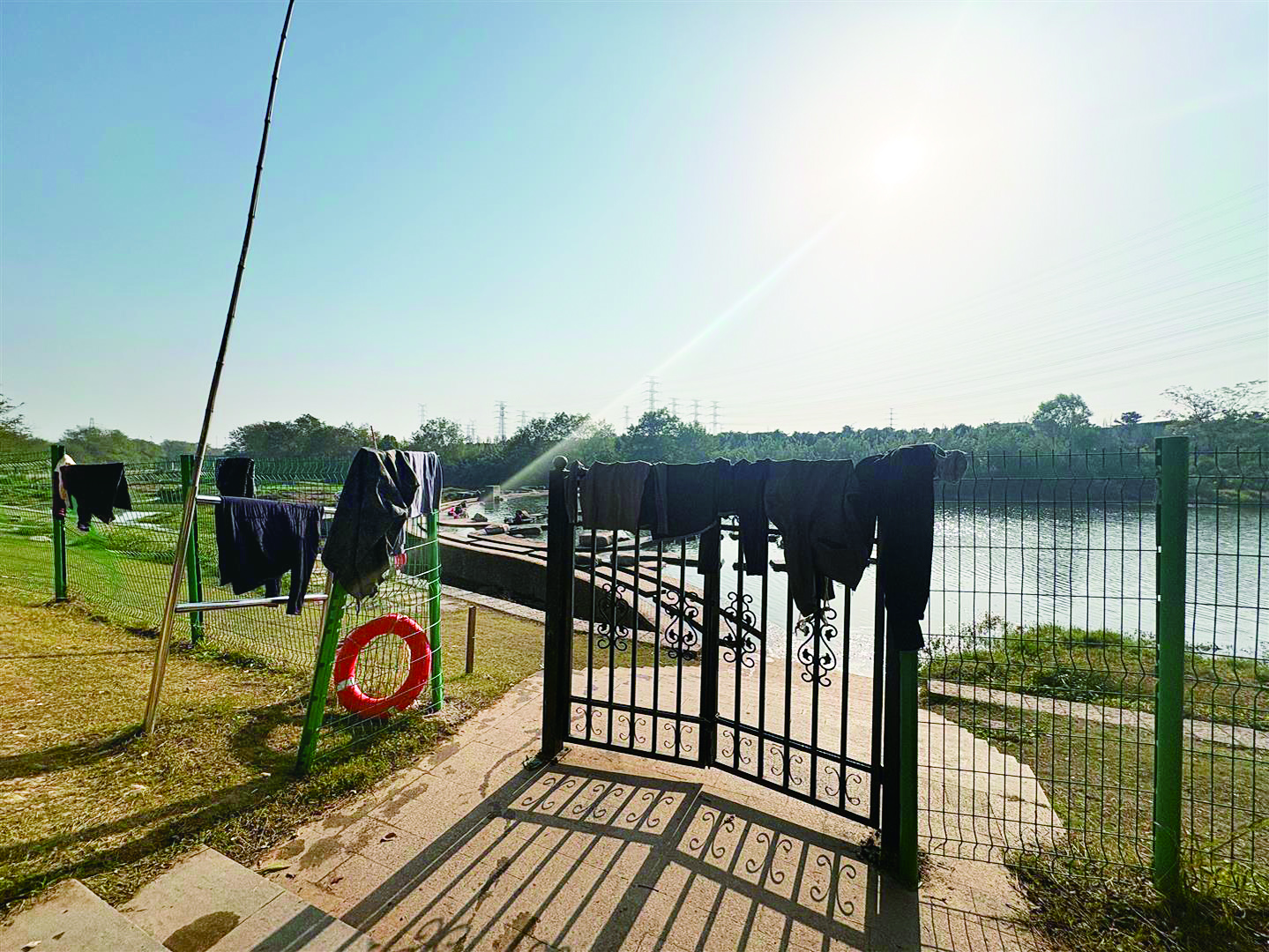 然而,这幅画卷正被不文明行为逐渐破坏。近日,记者在现场看到,不少市民专程骑车前来,在堰坝水域搓洗衣物。洗衣粉泡沫在水面漫延,菜叶、污渍顺流而下;护栏成了“晾衣架”,床单衣物挂满一排。现场,关于雅叶堰的介绍设施也已损坏,二维码无法正常显示,整个区域呈现出一种疏于管理的状态。不仅是在雅叶堰核心区,在距离其仅数十米处的梅溪岸边,记者同样发现了三三两两蹲坐洗衣的身影。