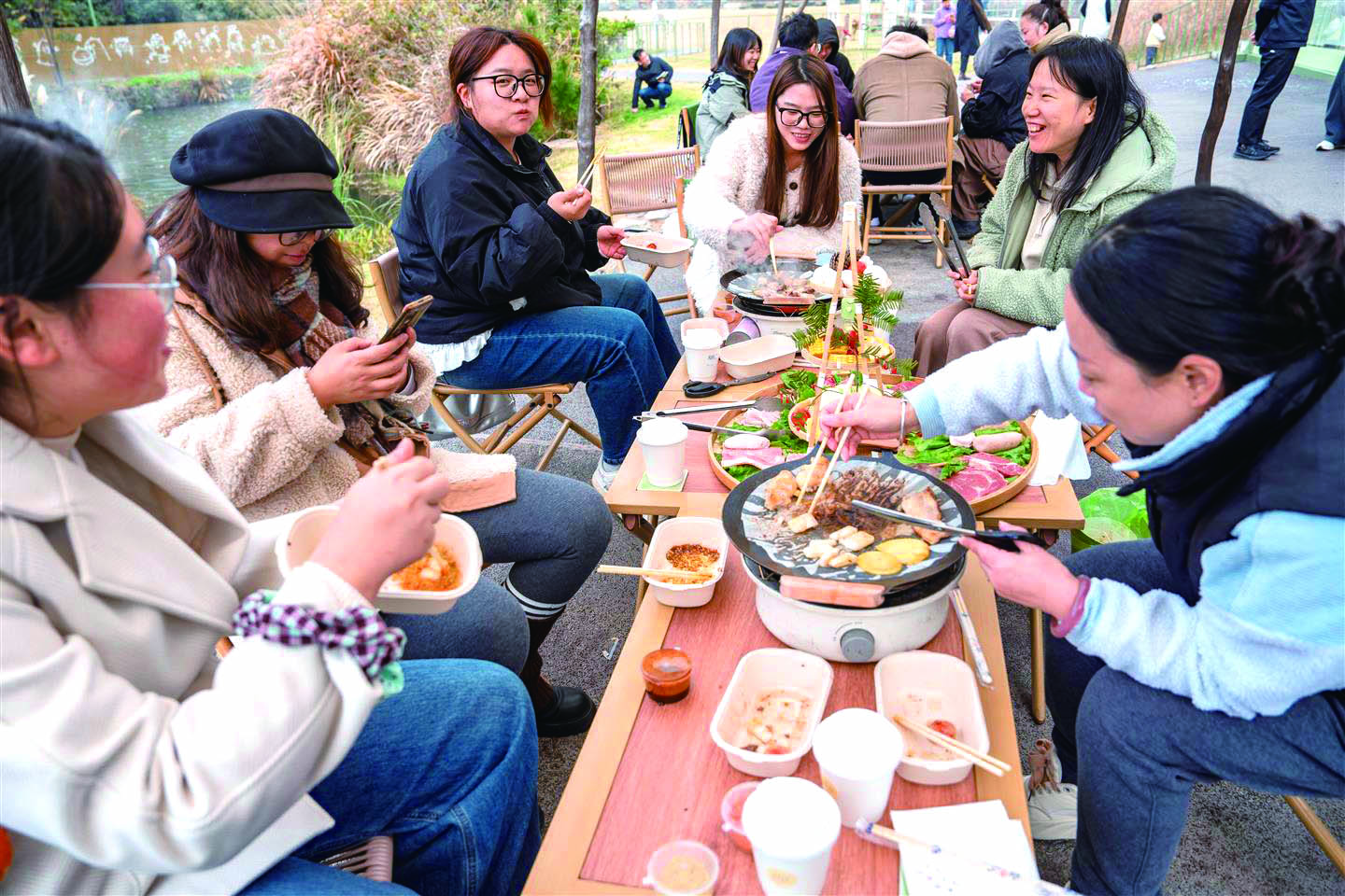 一壶清茶,热气腾腾;一盘烤肉,让人垂涎欲滴。温暖阳光下,不少市民选择与家人朋友共度休闲时光,烤肉、露营、围炉煮茶是初冬最惬意的打开方式。