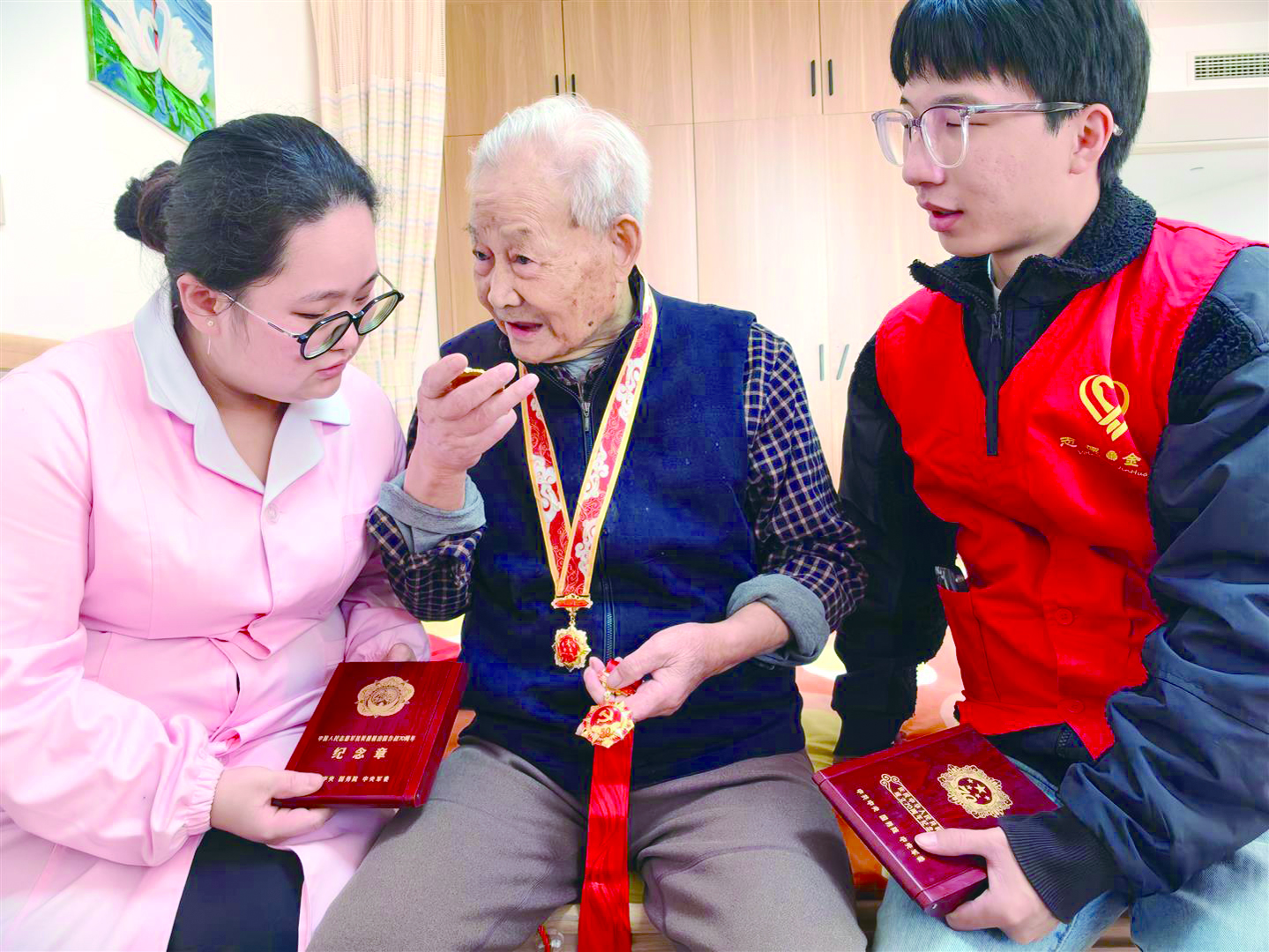 市福利中心里,护理员姚佳怿听抗战老兵讲过去的故事