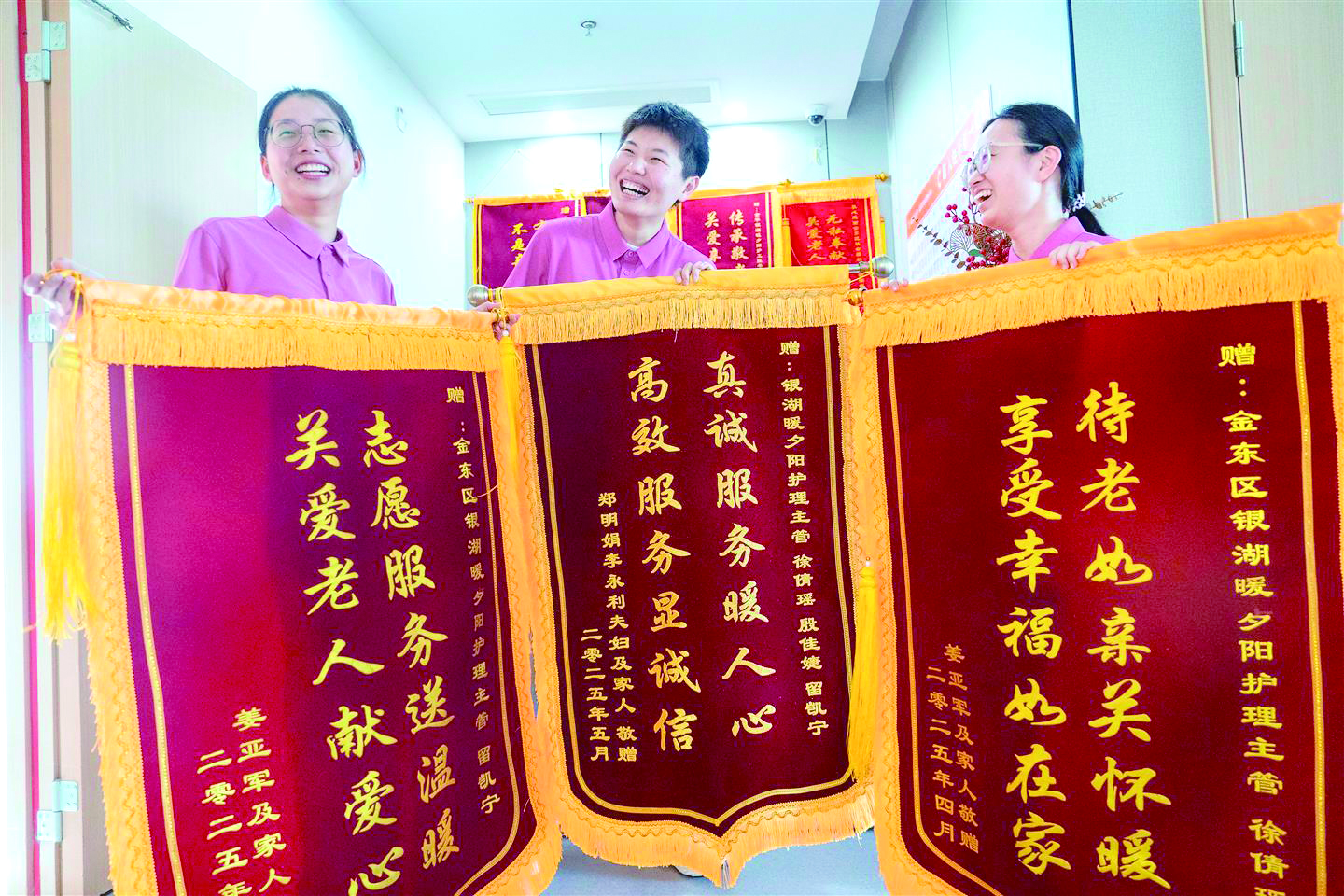殷佳婕、留凯宁和徐倩瑶收到家属刚送的锦旗非常开心