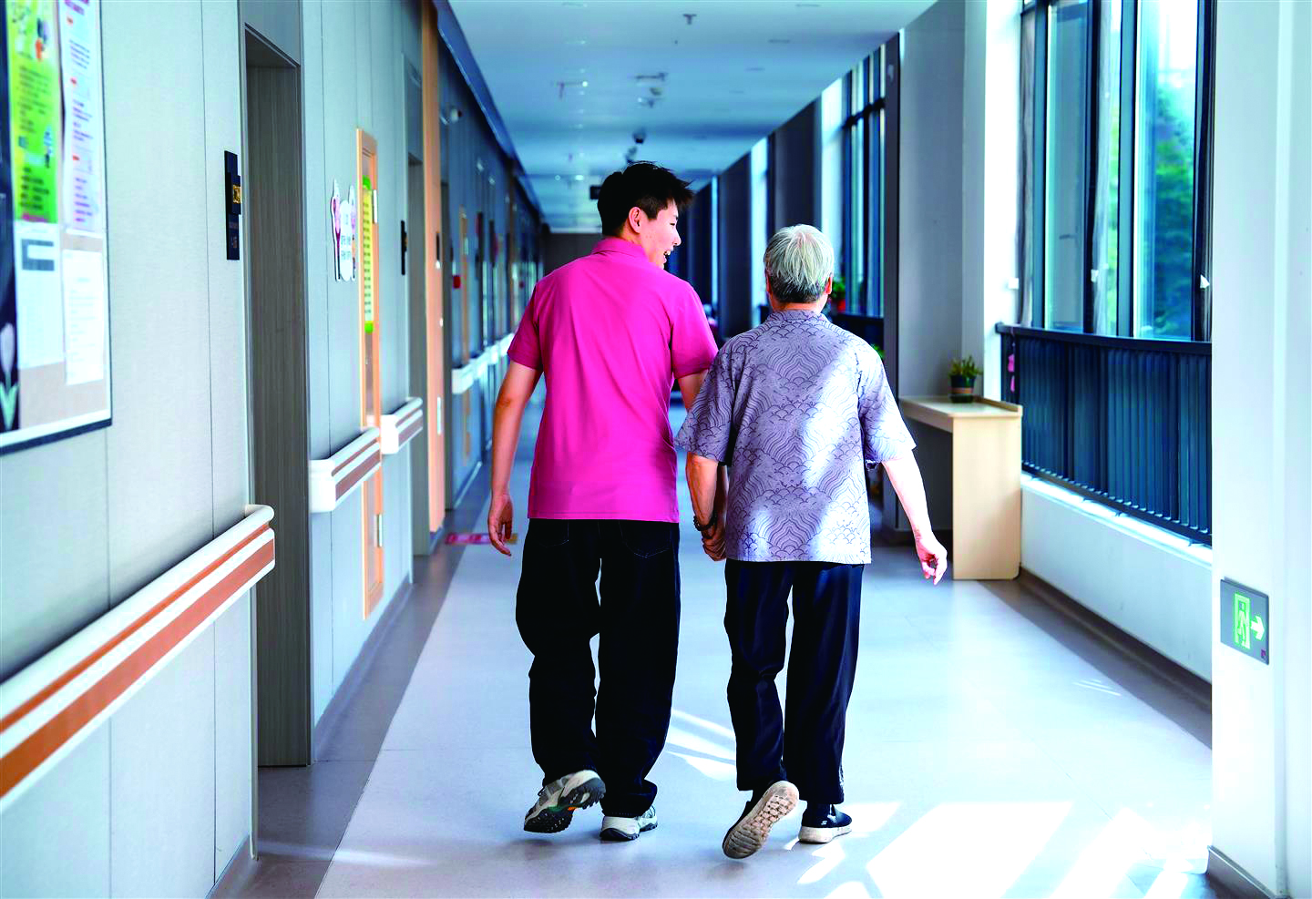 福利中心里,老人和殷佳婕手挽手走着