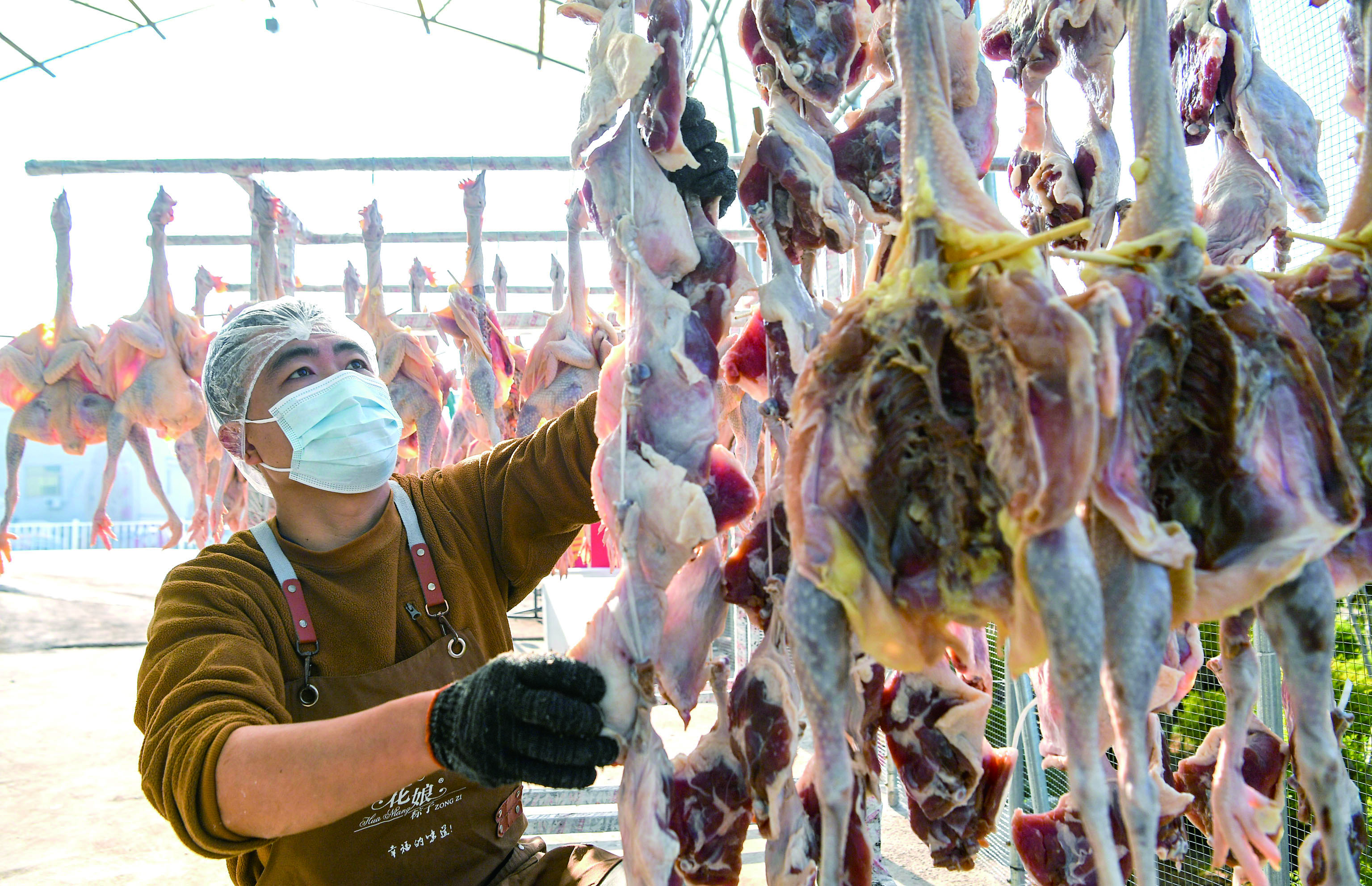 记者 时宽兵 文/摄 连日来,金东区赤松镇的腊味经营户趁着晴好天气,在阳光大棚里晾晒鸭腿、香肠、五花肉等腊味。 据了解,新鲜的鸡鸭经过清洗、腌制后,需要在阳光下晾晒20多天,达到六七成干后制成腊味,在阳光大棚中晾晒则是起到防虫、防尘作用。随着年底到来,各种腊味迎来销售旺季,经营户们忙着生产加工,满足消费者需求。