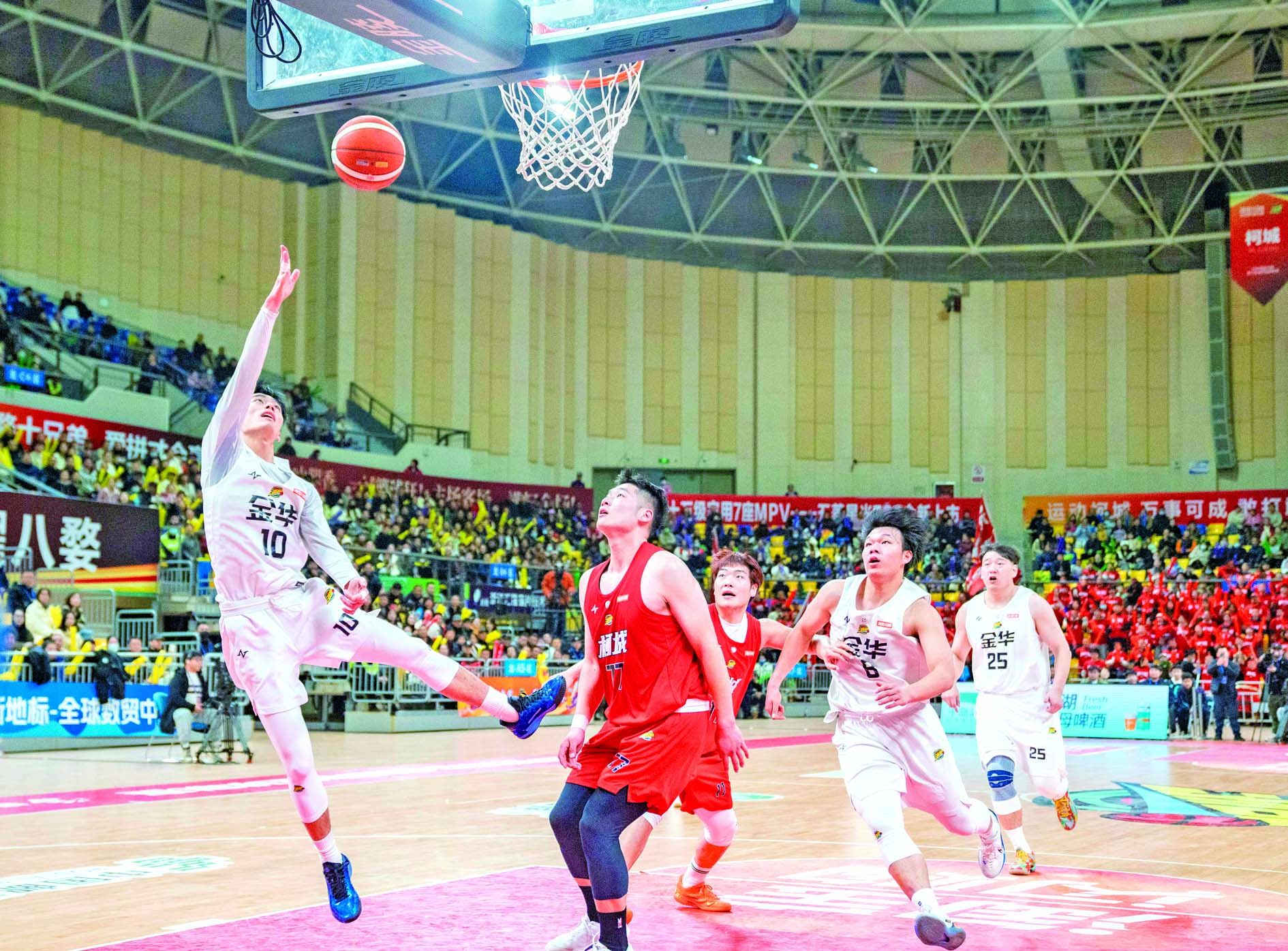 易边再战,场上风云再起。金华队队员金皓聪、范围、王哲烨相继突破得手,分差迅速扩大到两位数。三节战罢,金华队以54∶37领先。