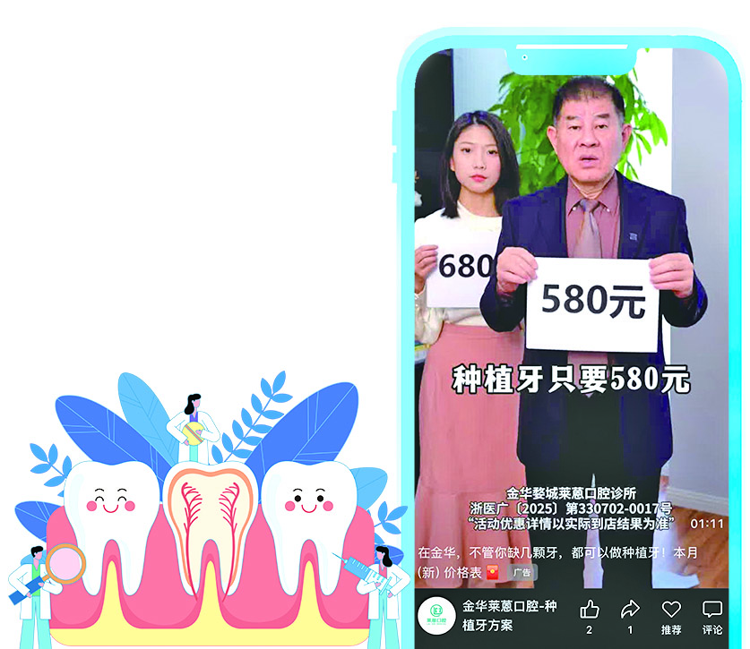 “种植牙只要580元”“不管缺几颗牙,都可以做种植牙”……这是记者日前刷到的“金华莱蒽口腔”微信号发布的视频广告。