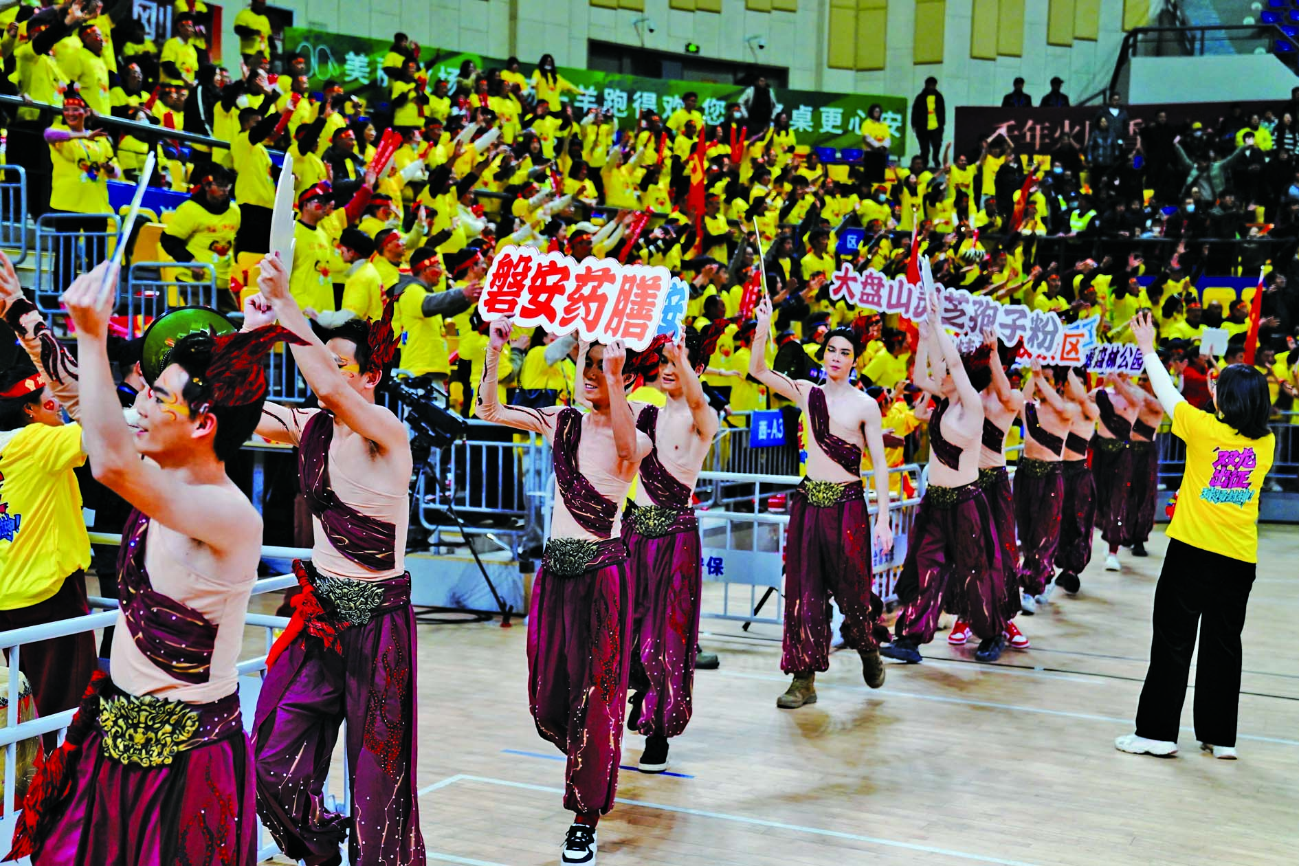 火上的舞蹈被巧妙转化为赛场中的艺术演绎,舞者们通过圆形、方阵等聚合式队形变换,再现仪式中团结协作的场景,以齐舞的形式,展现炼火者的勇猛气势。随着节奏由缓到急,舞步从“踏火山”的稳健逐步过渡到“闹火海”的激昂,展现人与自然共生的图景。
