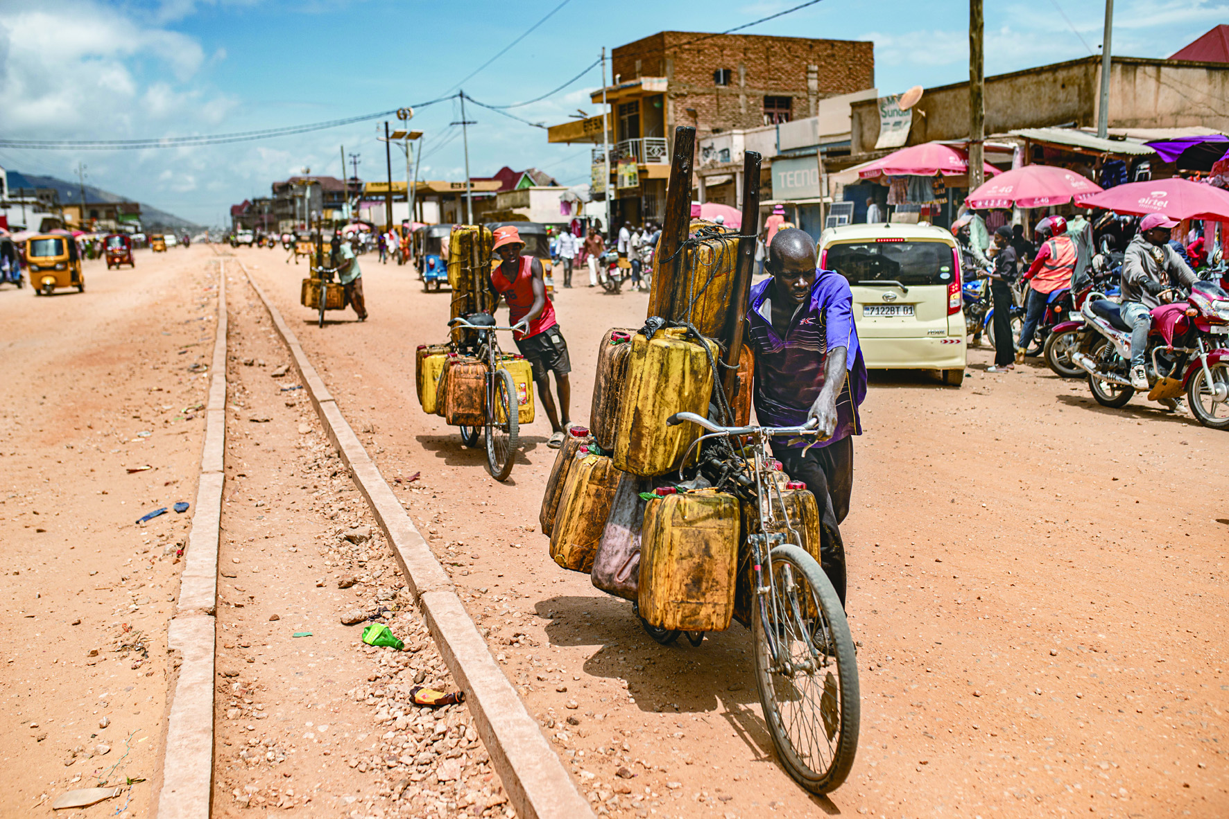 12月15日,在刚果(金)东部城市乌维拉,当地居民用自行车搬运汽油。 刚果(金)东部城市乌维拉毗邻布隆迪,是地区重要商贸枢纽。刚果(金)反政府武装“M23运动”15日晚宣称,将单方面从乌维拉撤出部队。“M23运动”还称将继续支持现有和平进程。 新华社发