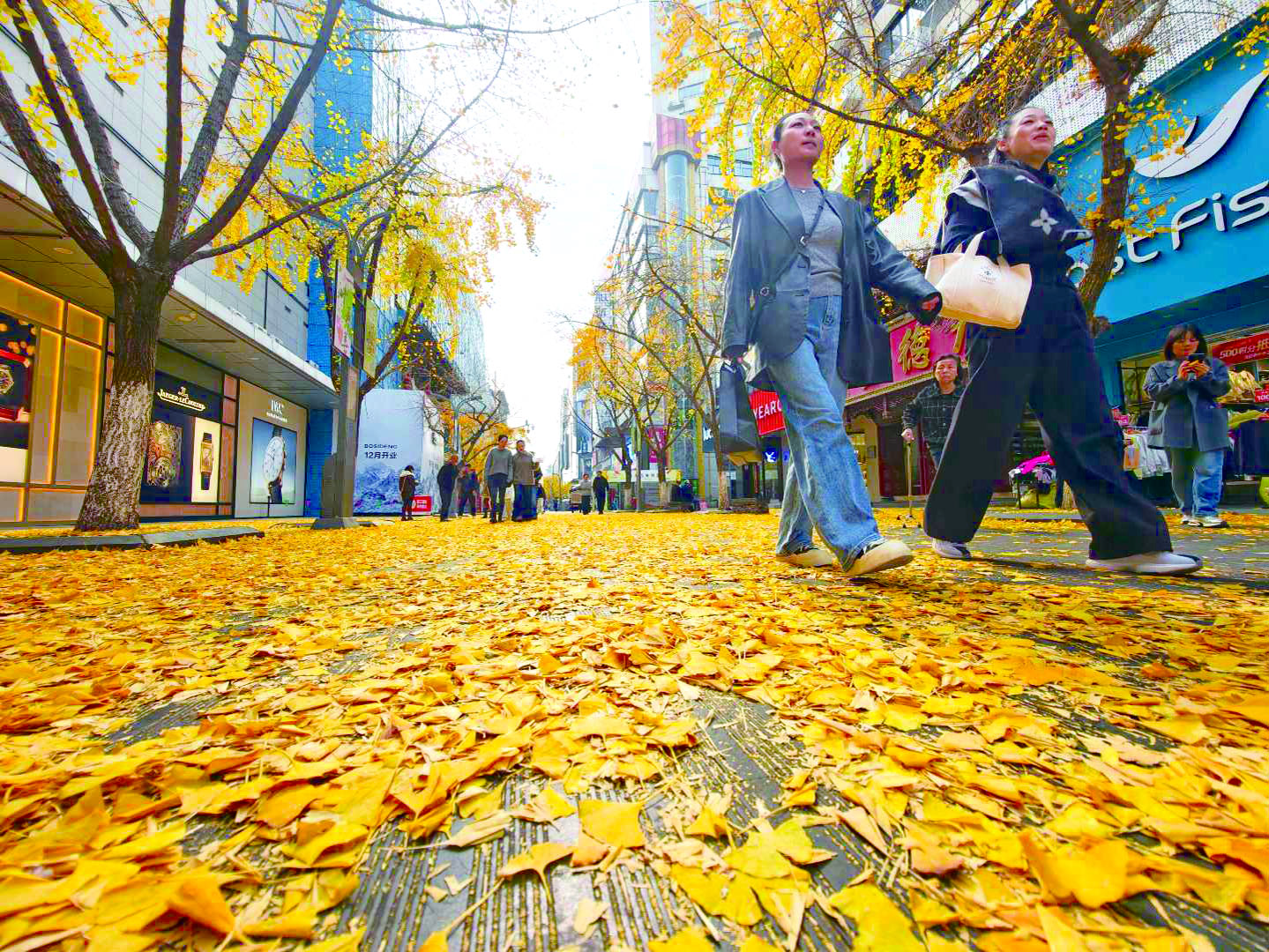 记者 傅俊 文/摄 冬至将至,银杏相继进入落叶期。昨日,市区西市街步行街两旁的银杏树枝头尚有金黄树叶摇曳,地上已然铺开松软厚实的“金毯”,形成别样景致,路过市民纷纷拿出手机、相机,记录下这美好的景色。