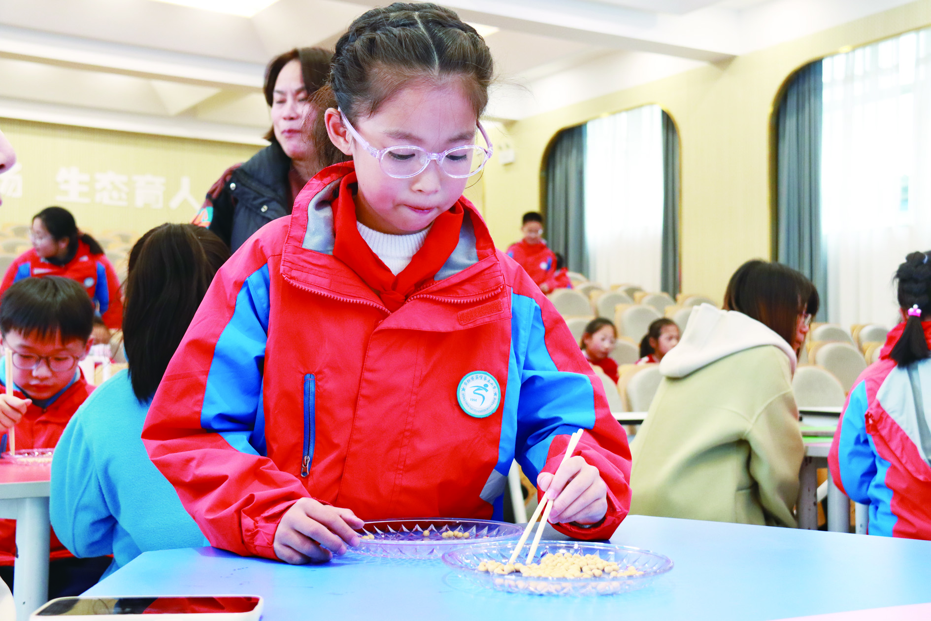固定类项目覆盖运动、劳动、科技三大领域,各有亮点。运动类项目的比拼在操场拉开帷幕,一分钟跳绳、仰卧起坐、立定跳远等项目中,学子们或飞速挥绳、或咬牙坚持、或奋力起跳,尽显活力与毅力。劳动技能区聚焦筷子夹黄豆项目,选手们无论动作娴熟与否,都展现出十足韧劲,成为学校劳动教育成果的生动体现。科技类项目则按年级分层设计,涵盖纸飞机、纸陀螺、扑克牌搭高、纸桥承重、纸青蛙跳远、气球小车等,兼顾趣味性与探究性,让不同年龄段学子都能感受科技魅力。