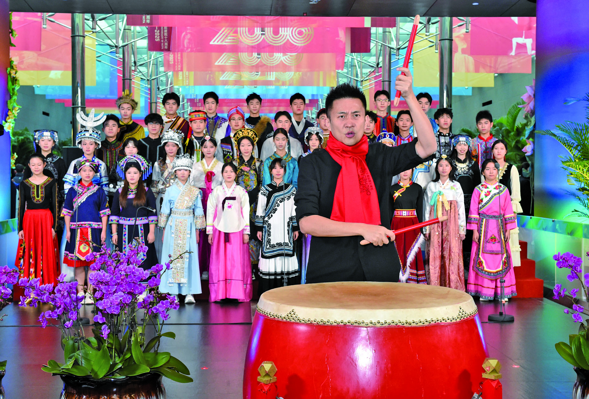 12月22日,演员在国家大剧院北门入口处敲响迎宾鼓,拉开活动序幕。