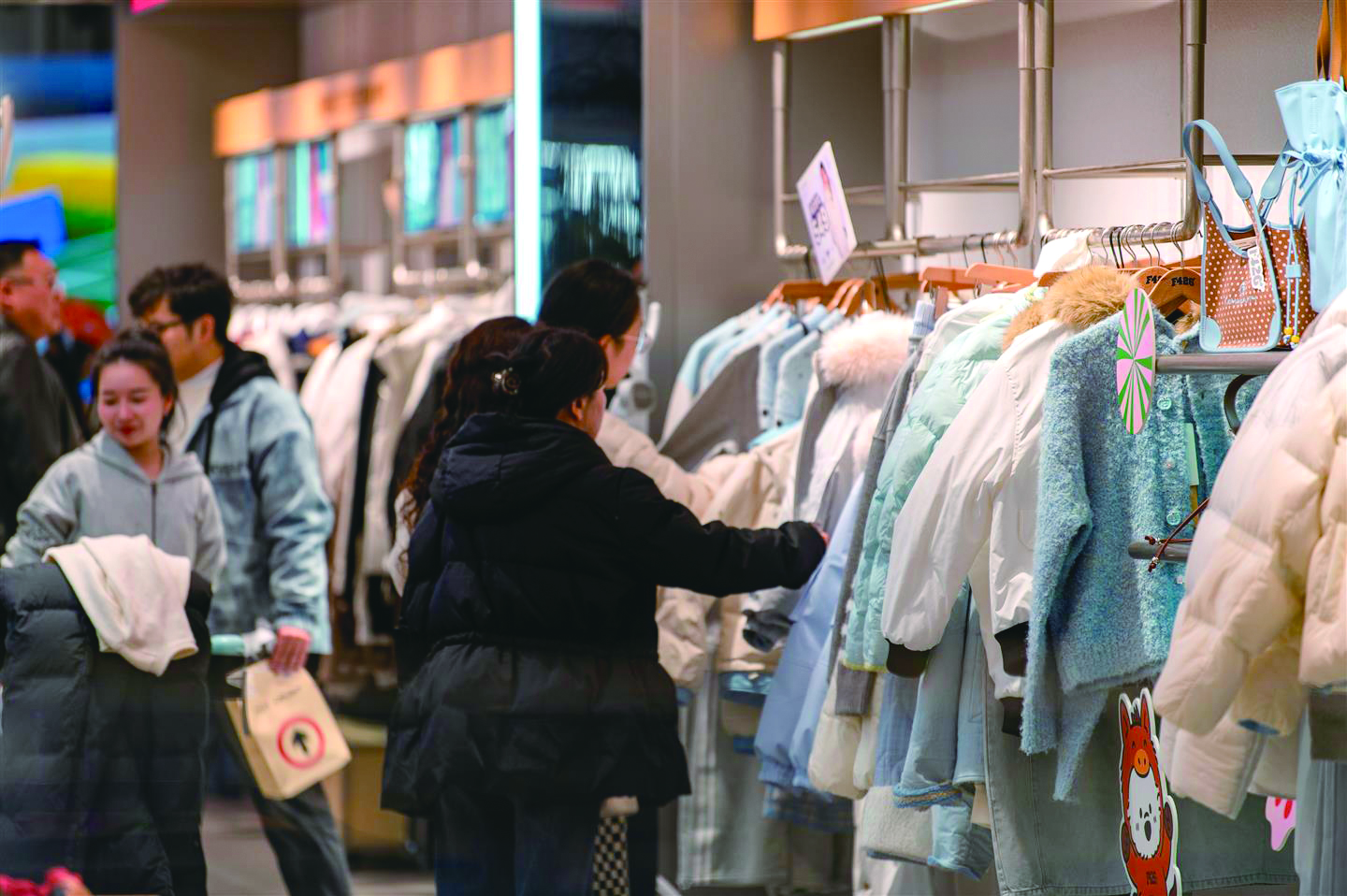 12月21日,市区一商圈服装店内,顾客在选购冬衣。
