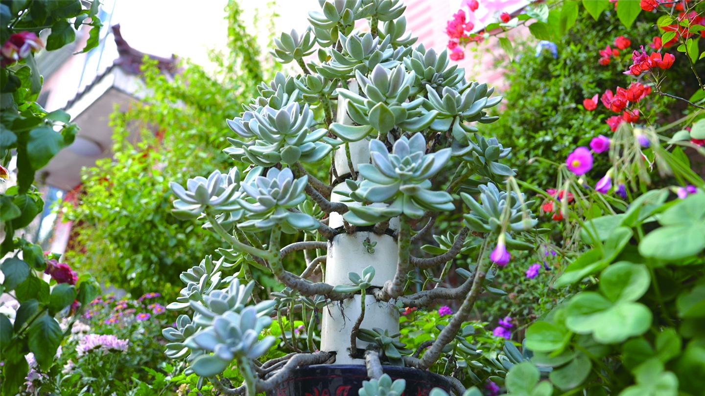 徐华对待每一盆花都如同对待一件珍贵的艺术品,他会根据不同花卉的生长特性与形态特点,构思出最合适的造型方案。瞧,眼前这盆多肉植物宛如一座精致的宝塔,层层叠叠,错落有致。徐华运用一节节PVC管,如同搭建积木一般,为多肉植物构建起稳固又美观的“骨架”。在PVC管的支撑与引导下,多肉植物的叶片沿着特定的轨迹生长,逐渐长成了令人眼前一亮的宝塔形状。