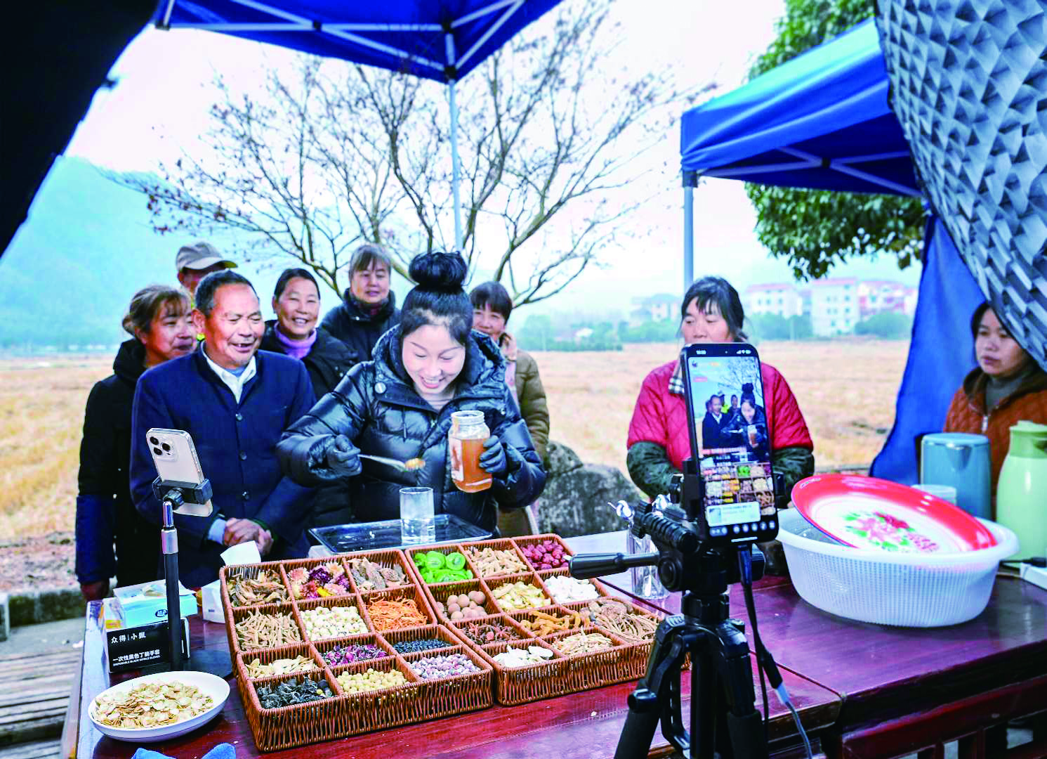 12月24日,在婺城区沙畈乡高儒村,村民在专业主播的指导下,通过手机向网友们介绍农特产品。“村里来了专业的直播团队,我们的农特产品有了更好的销路。”