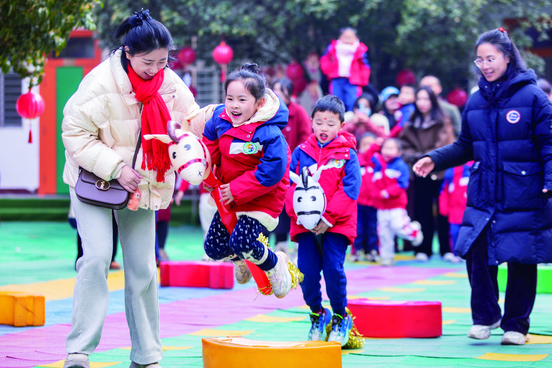 12月30日,学生在湖北省襄阳市樊城区第五幼儿园开展的迎新年亲子活动中进行趣味游戏。 元旦将至,全国多地学校和幼儿园举办丰富多彩的校园活动,让孩子们在快乐喜庆中迎接新年的到来。 新华社发