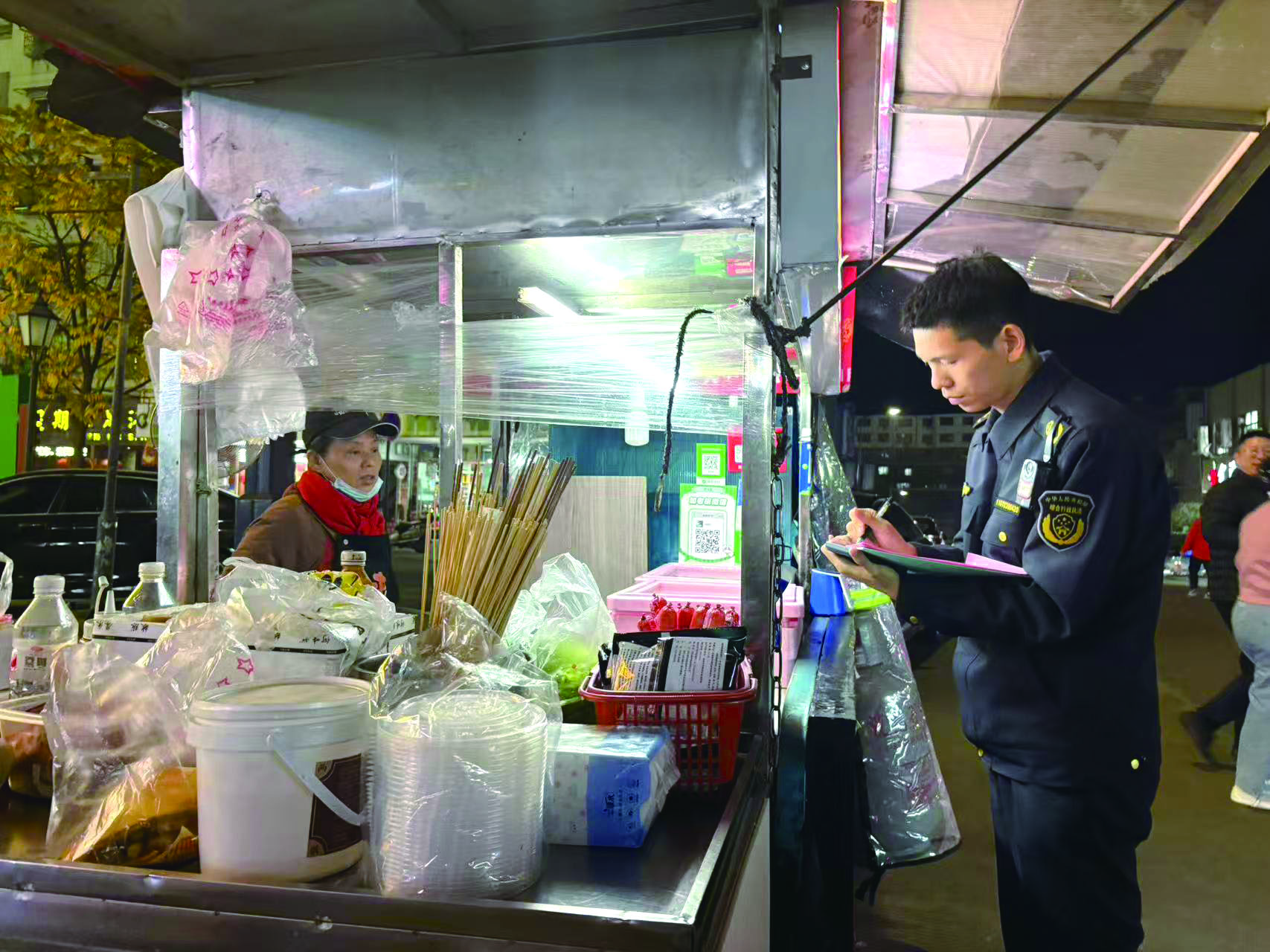 “你好,这里不能摆摊,第一次我们先发提醒单。”现场,执法队员向炸年糕的摊主耐心解释。摊主陈师傅接过粉色提醒单后,主动整理物品并表示配合。