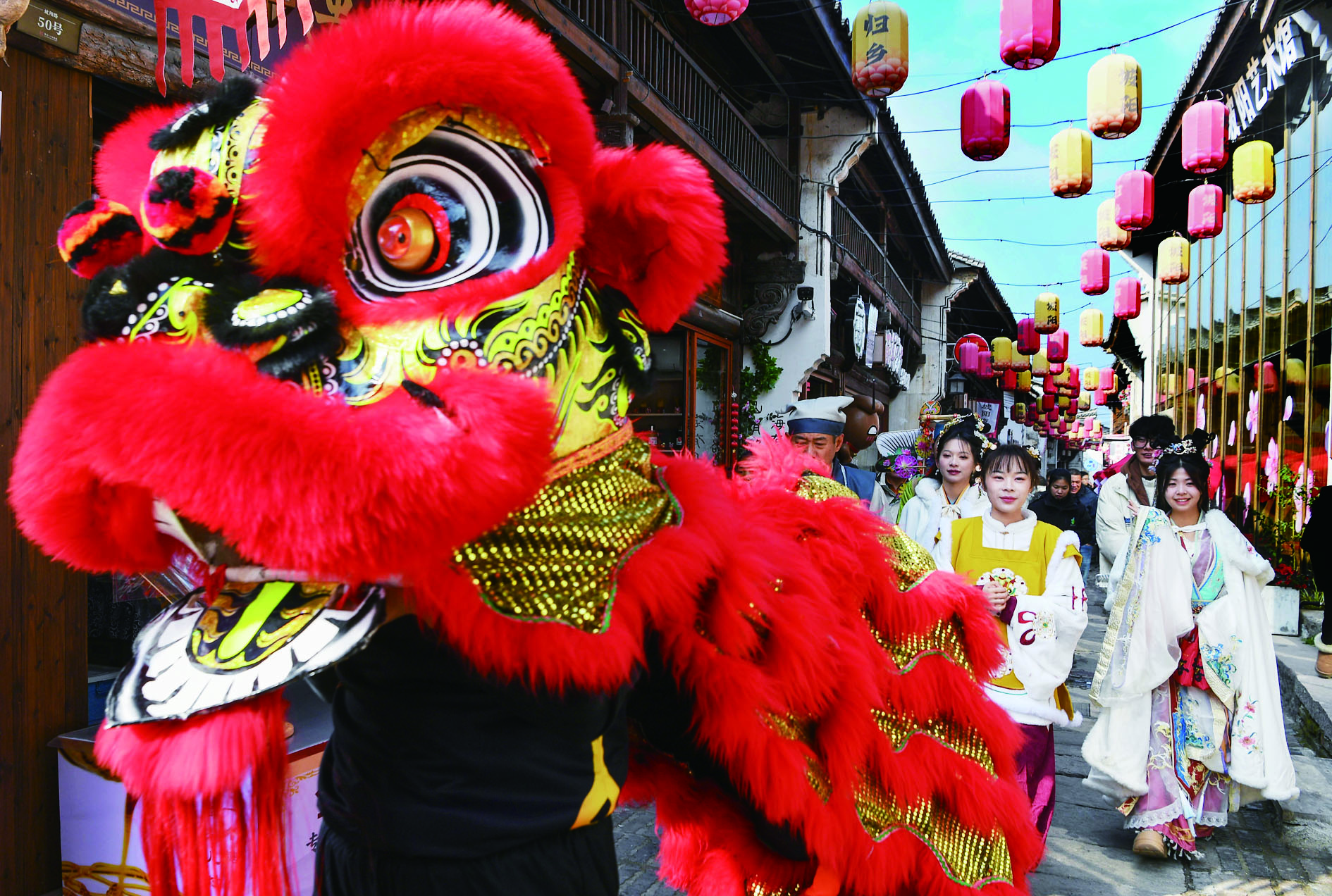 记者 时宽兵 文/摄 1月2日,金东区岭下镇坡阳古街举办丰富多彩的文旅活动,吸引了不少市民游客。游客们逛古街,观看舞狮、舞台剧等表演,与汉服巡游演艺人员互动,品尝当地特色小吃,体验古街民俗风情,乐享假期生活。