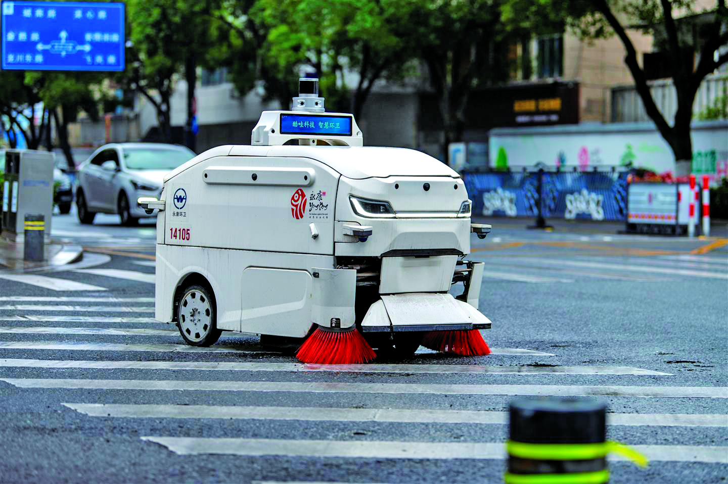 记者 胡肖飞 文/摄 1月5日,永康市丽州路人行道上,一台环卫机器人在自动洗扫保洁路面。 据了解,环卫机器人通过搭载的传感器和AI系统,可实现红绿灯识别响应、障碍物动态监测、路径自动规划、垃圾识别和追踪等功能,且可自动加水、自主充电,提高了城市保洁智能化作业水平。