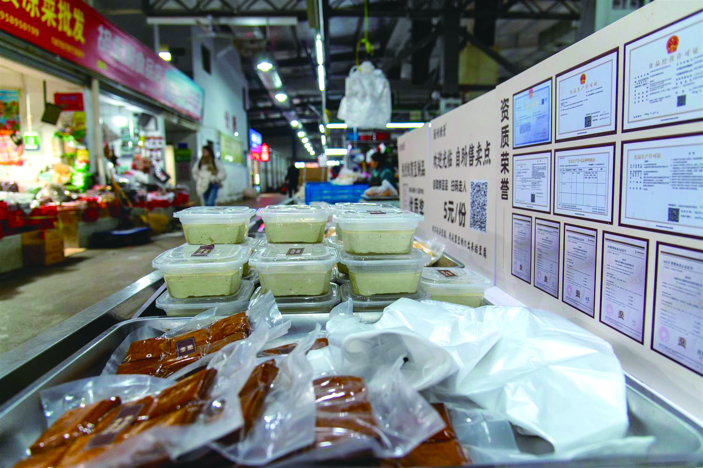 1月5日,永康市华丰菜场豆制品销售区的一处自助售卖点,陈列着千张、黑豆腐、香干等多种豆制品,引人注目。