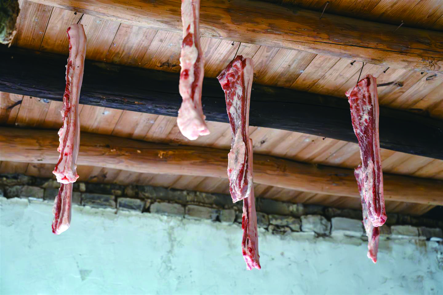 下仇村村民仇炎亮最近刚在自家老房子的房梁下挂上了几条猪五花肉。“挂上去没几天,肉还是鲜红的。”仇炎亮说,以前家里的年猪杀完后,他挑上几条五花肉,抹上白酒后,就挂在老房子的房梁下,让山风和时间共同打造独特的风味。挂风肉的时间和位置也都有讲究,“肉要挂在朝北的屋子里,这样才能用阴凉风把肉吹干,挂肉的时间一定要选在冬至日的前后5天,太早的话,容易生虫”。