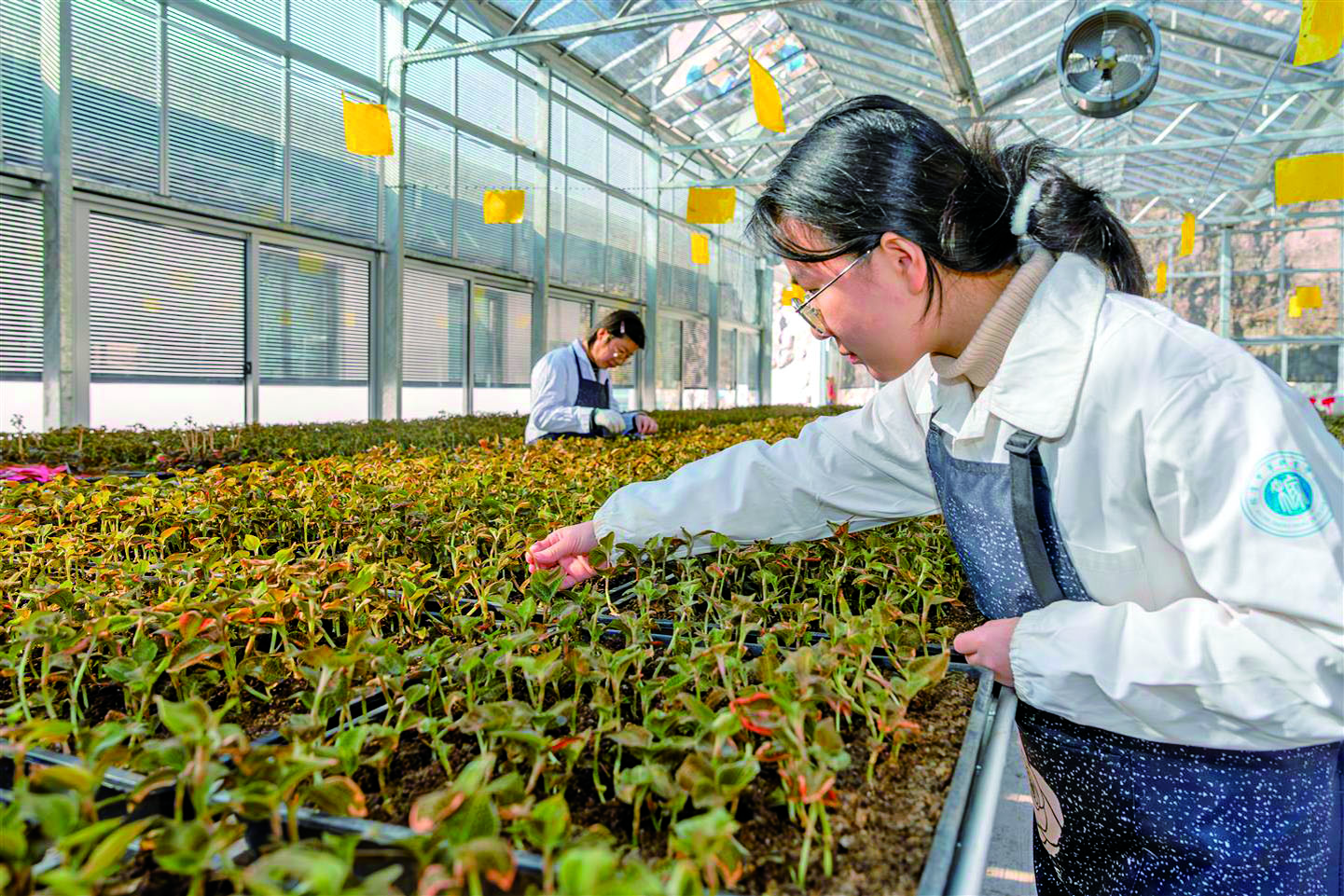 昨日,在位于兰溪市梅江镇的金线莲数智生产基地种植大棚内,工作人员忙着检查金线莲种苗的生长状态。