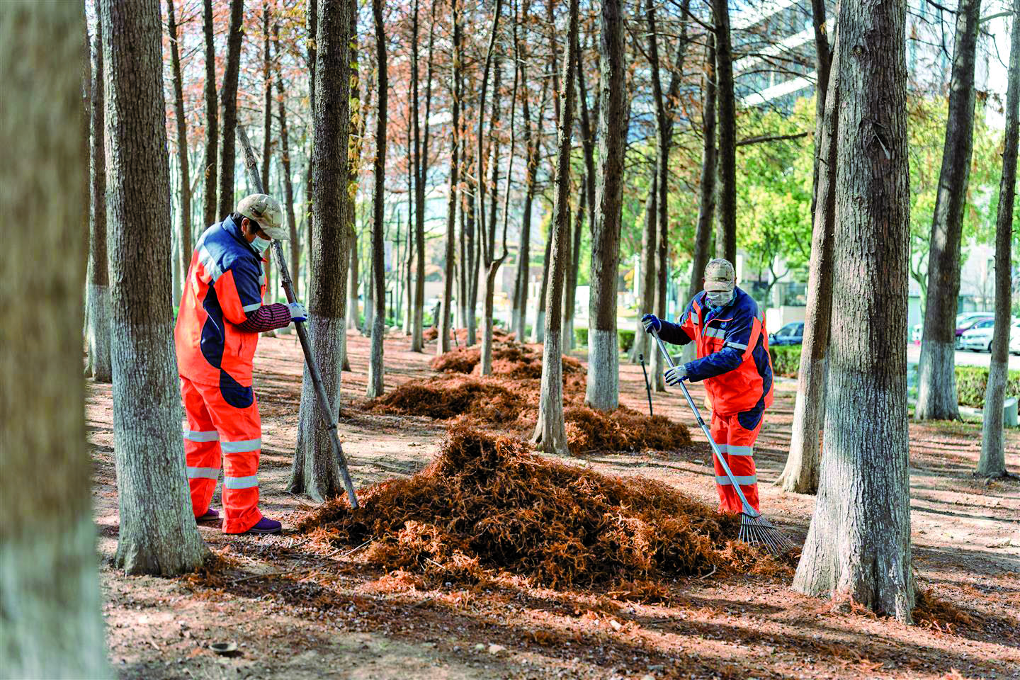 记者 楼冀阳 文/摄 昨日,在金东区建筑艺术公园的一片水杉林内,环卫工人正在清理地上的水杉树叶。据现场工作人员介绍,满地的红叶虽美,却存在安全隐患,为做好公园防火工作,他们会定期清理掉落的叶子,运往发电厂进行焚烧发电。