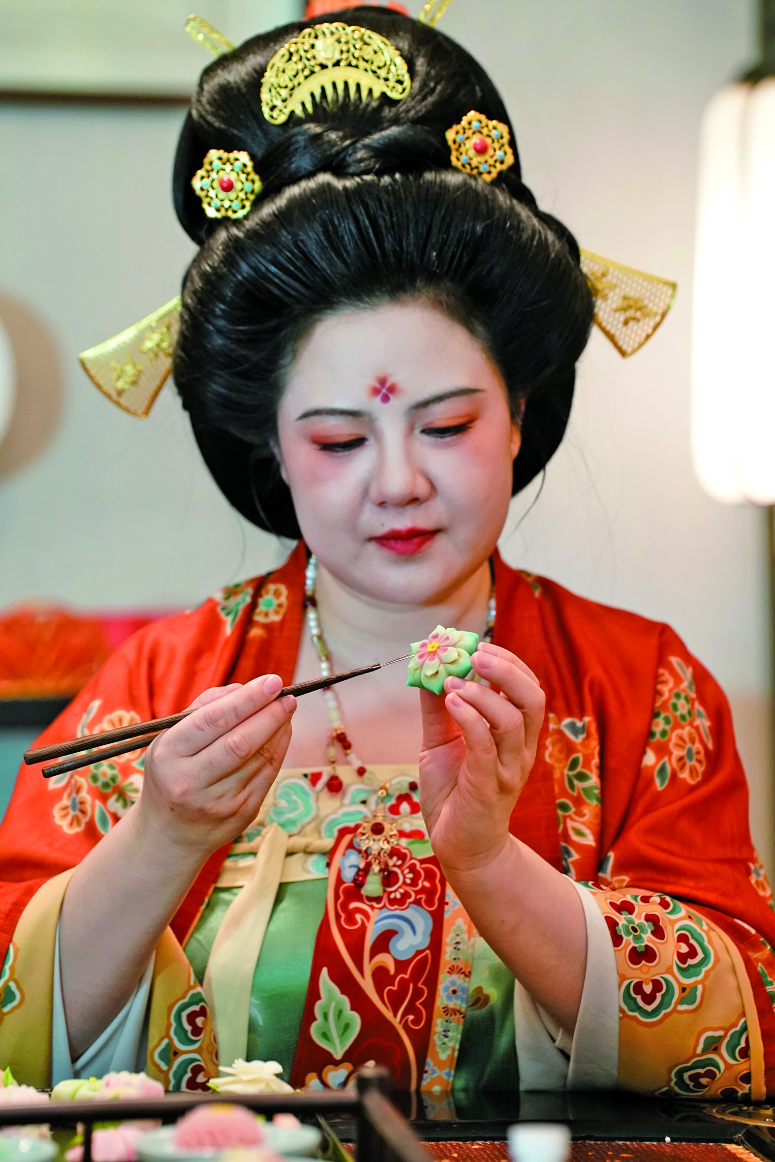 唐果子,是起源于唐代的传统特色糕点,佐茶而食,其造型精致、色彩丰富,曾在唐代宫廷贵族中流行。在西安,有着多年烘焙工作经验的“80后”李欢,一次偶然的机会与唐果子结缘。2020年,李欢与志同道合的伙伴成立公司,创立了“开元风雅”品牌,李欢也成为了品牌的主理人。她和团队埋首于唐代饮食文献之中,行走于各大博物馆内,从唐代文物的花纹图案中汲取灵感,结合健康饮食和现代口味需求精心调整配方,成功“复现”出一枚枚精巧的唐果子,受到人们的欢迎。