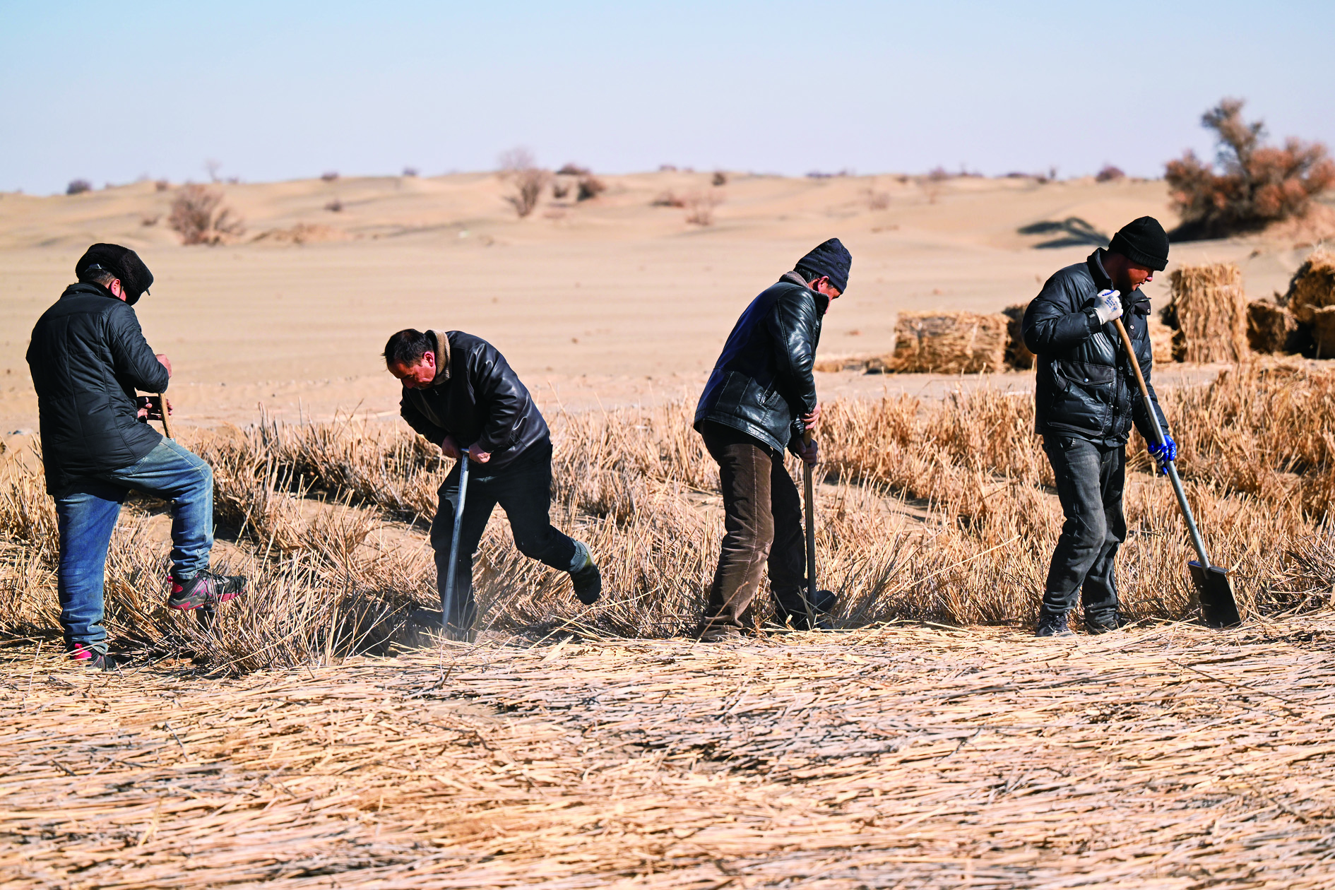 在新疆和田地区墨玉县喀瓦克乡周边沙漠,当地农民在铺设草方格(1月11日摄)。 寒冬时节,尽管塔克拉玛干沙漠南缘的新疆和田地区墨玉县气温跌破零摄氏度,这里却涌动着治沙攻坚的热潮。数十台推土机轰鸣作业,推筑阻沙堤、平整沙丘,本地农户忙着收割加工芦苇、铺设草方格,冬季治沙工程高效推进。 自2024年11月环塔克拉玛干沙漠生态屏障全面锁边合龙后,新疆系统性推进防沙治沙工作,持续筑牢南疆生态安全防线。与此同时,农民来到治沙一线,“农闲治沙、农忙务农”让他们在家门口获得稳定收入。 新华社发
