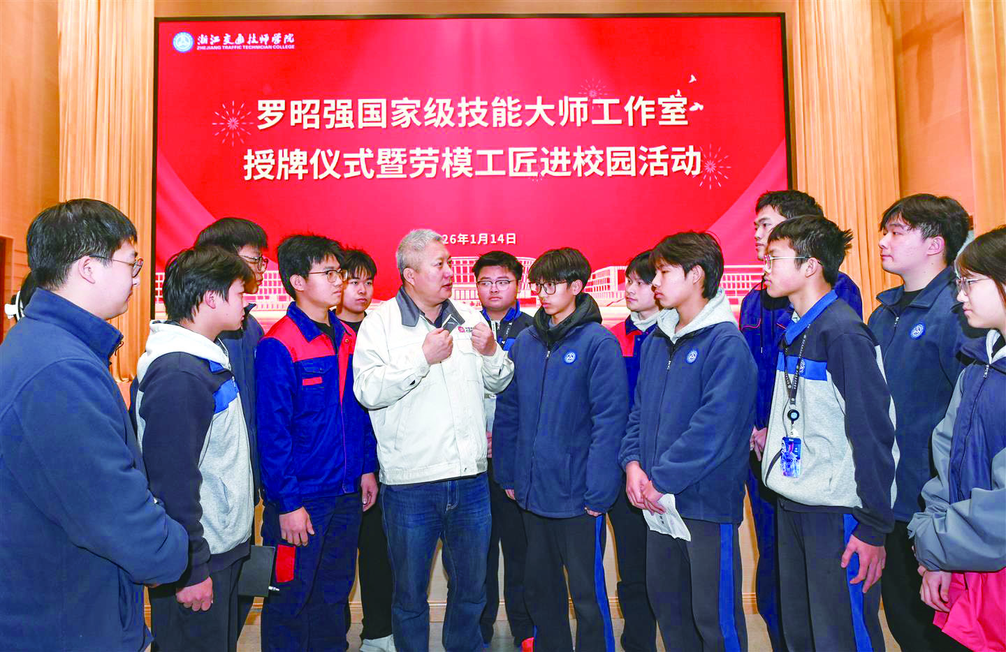 1月14日下午,浙江交通技师学院举行罗昭强国家级技能大师工作室授牌仪式暨劳模工匠进校园活动。