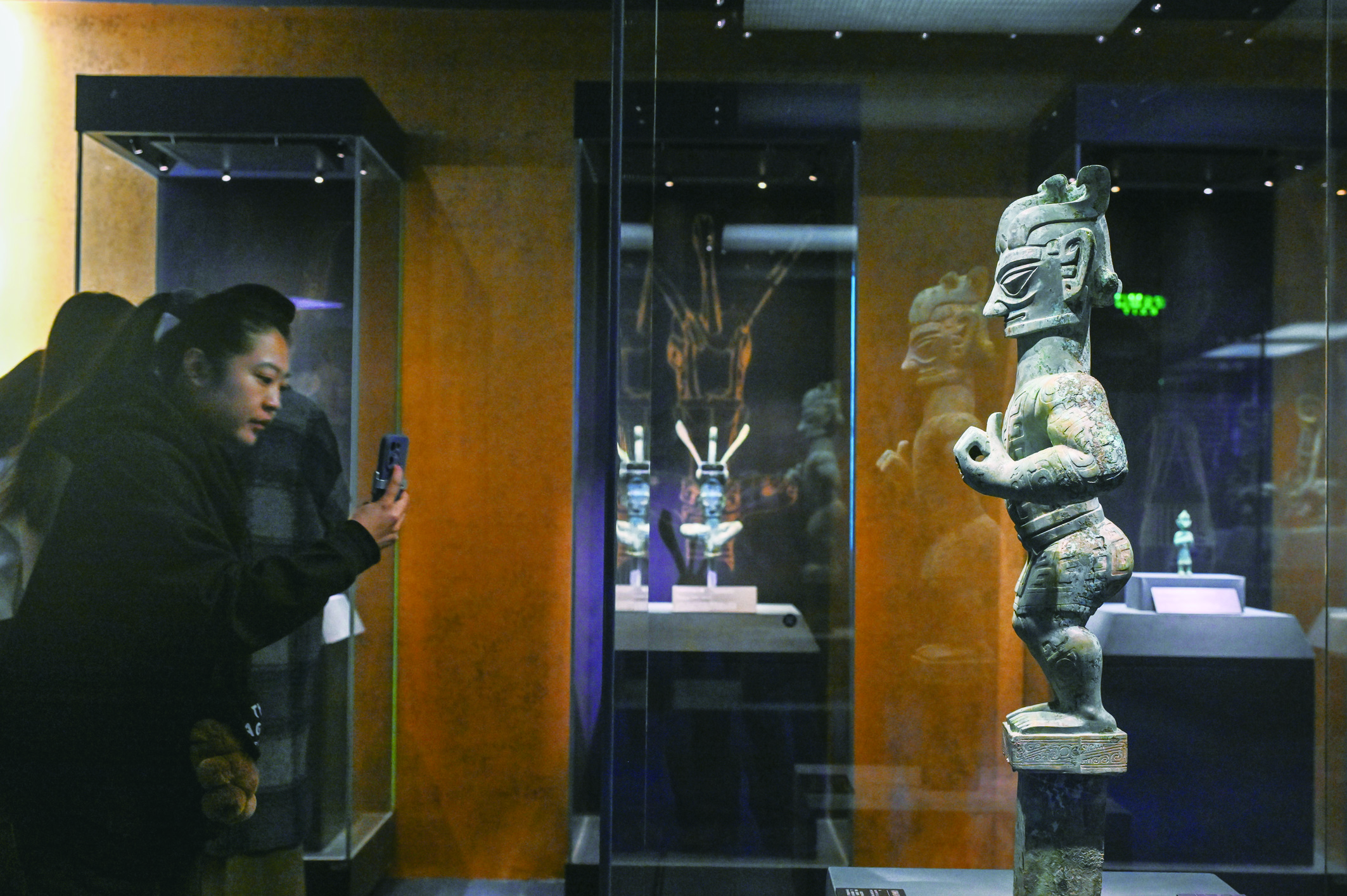 1月18日,观众参观展出的青铜着裙立人像。 1月18日,由国家文物局指导,中国国家博物馆、四川省文物局主办的“双星耀世——三星堆—金沙遗址古蜀文明展”在北京中国国家博物馆开幕,展期为7个月。 本次展览荟萃200余件(套)来自三星堆博物馆、成都金沙遗址博物馆、四川省文物考古研究院、成都市文物考古研究院以及中国国家博物馆的精美文物,引领观众步入神秘而辉煌的古蜀世界。 新华社发