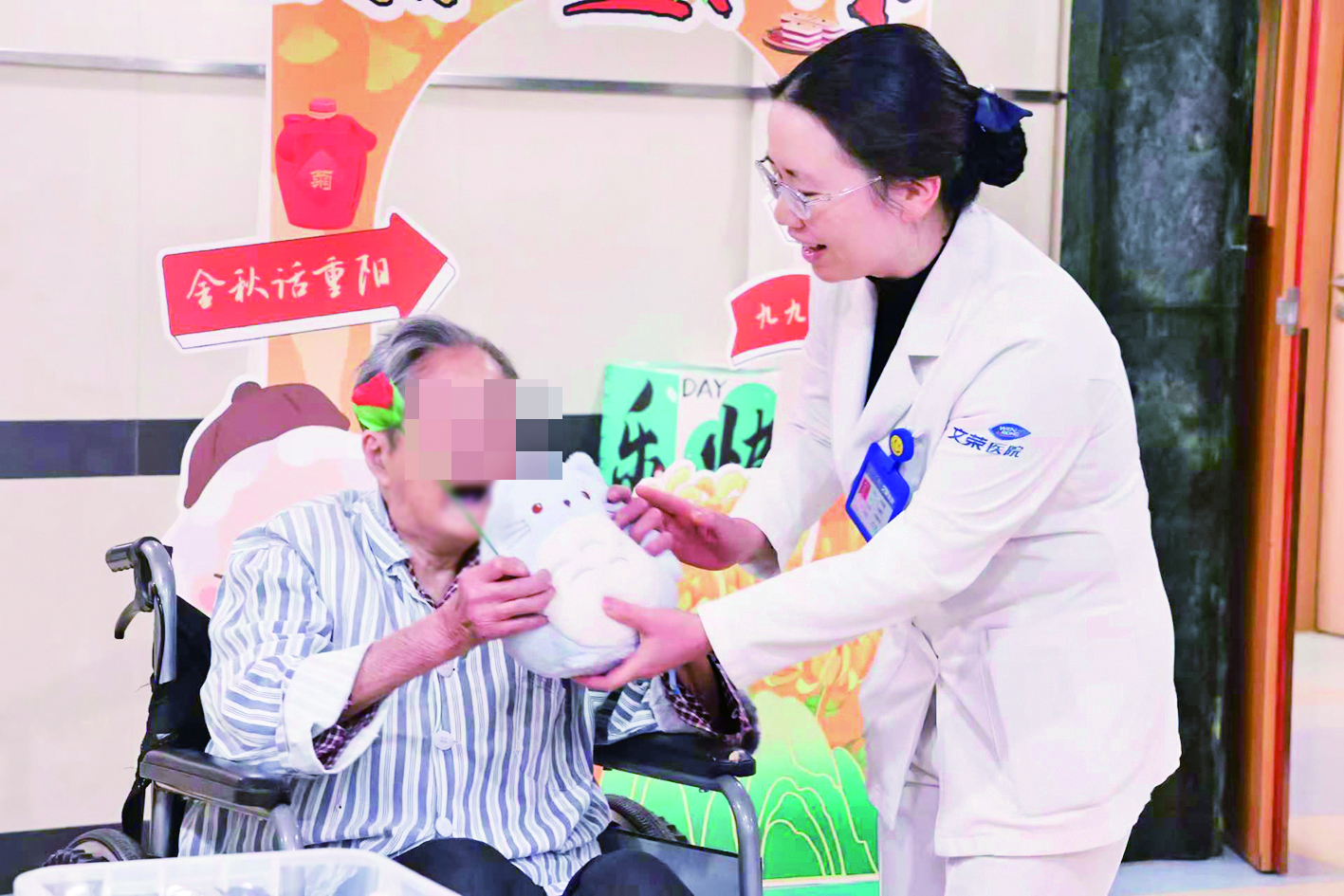 人文关怀是老年医学科的另一张“名片”。科室不仅为长期卧床老人提供剪指甲、理发、洗脚、掏耳朵等生活服务,还联系志愿者为老人提供精神陪伴。有一次,一位80多岁的住院老人无意间提到过几天是她的生日,医护团队悄悄安排,用心为她准备蛋糕,帮她梳理头发,举办了一场简单而温馨的生日会,老人特别感动:“没想到在医院还能过上这么有意义的生日,医护人员就像家人般细心。”从那以后,每月月初,护士长都会精心准备,为当月过生日的老年患者集体庆生。端午节、重阳节等传统节日,科室组织特色活动,让住院老人始终能感受到家的温暖。