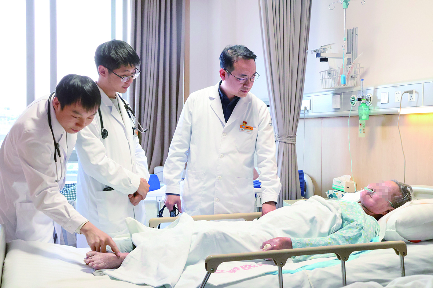 老年人多病共存、用药复杂是老年医疗的突出难题。78岁的王大爷患有冠心病、慢阻肺、糖尿病等多种疾病,每天需要服用20多种药物,不仅肠胃负担重,药效也相互影响。周亮良团队接诊后,通过全面的老年综合评估,在不影响治疗效果的前提下,对药物进行科学整合,将用药种类精简至10种,并根据其营养状况调整饮食方案,建议将虾、肉等食材煮烂食用,替代营养单一的白粥,有效降低了药物副作用,改善了老人的营养状况。