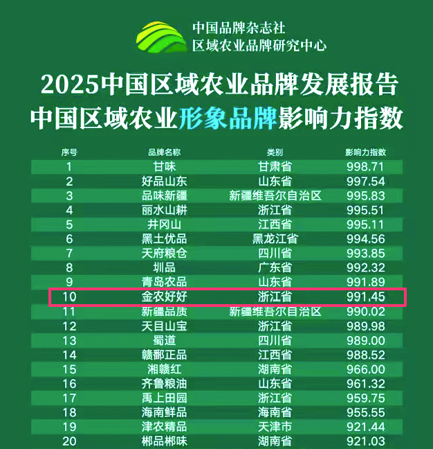 日前,2025区域农业品牌年度盛典在北京举办,“金农好好”跻身“2025中国区域农业形象品牌影响力指数TOP100”前十,在全国参评的130个地市级品牌中位列第三。该指数基于品牌传播力、资源开发力、市场号召力等维度综合测算,覆盖全国千余个区域农业品牌,是评估中国各省级、市级农产品区域公用品牌综合影响力的权威指标。