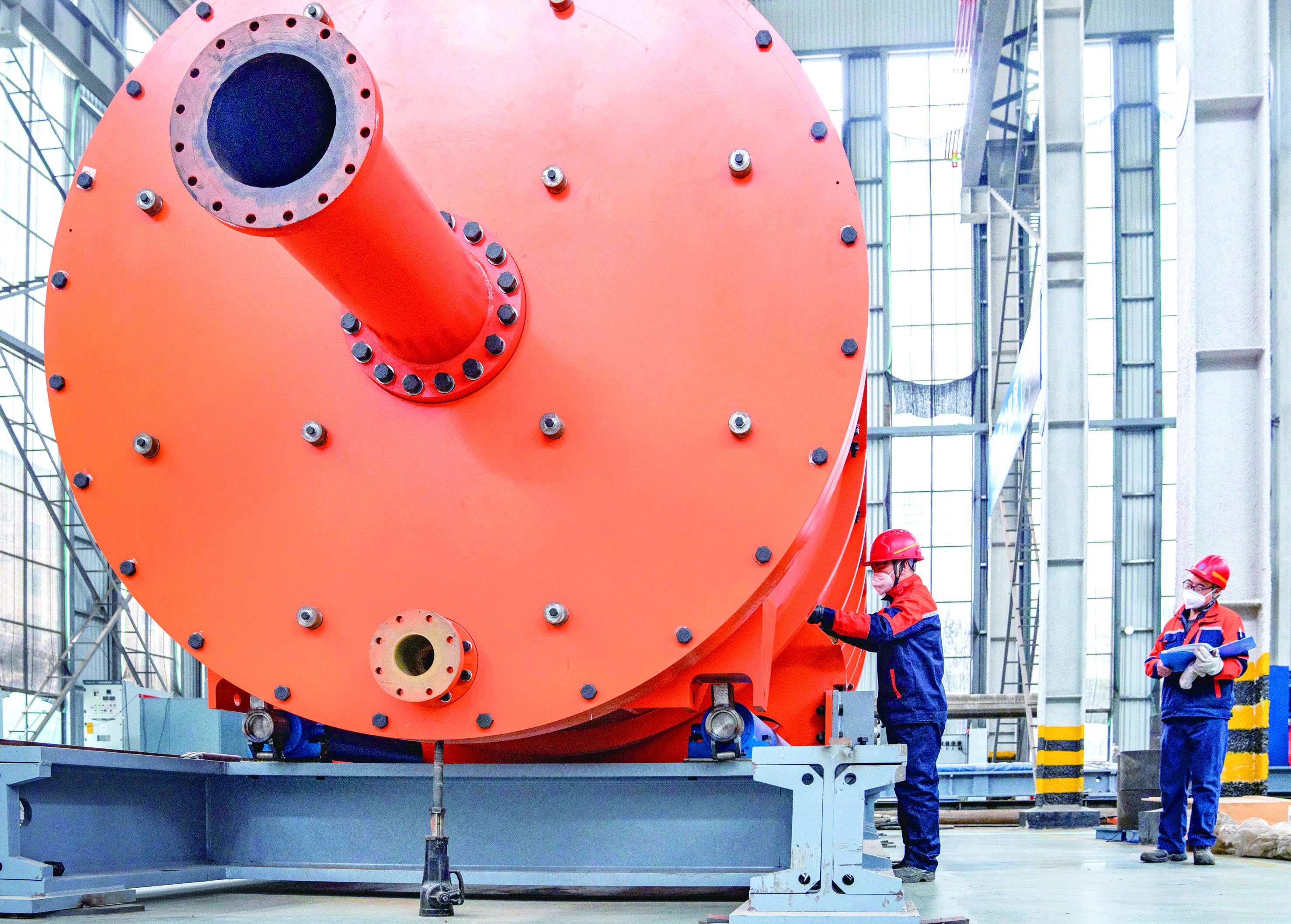 在浙江艾领创矿业科技股份有限公司装配车间内,工作人员对准备出口的20000L艾砂磨机进行检查