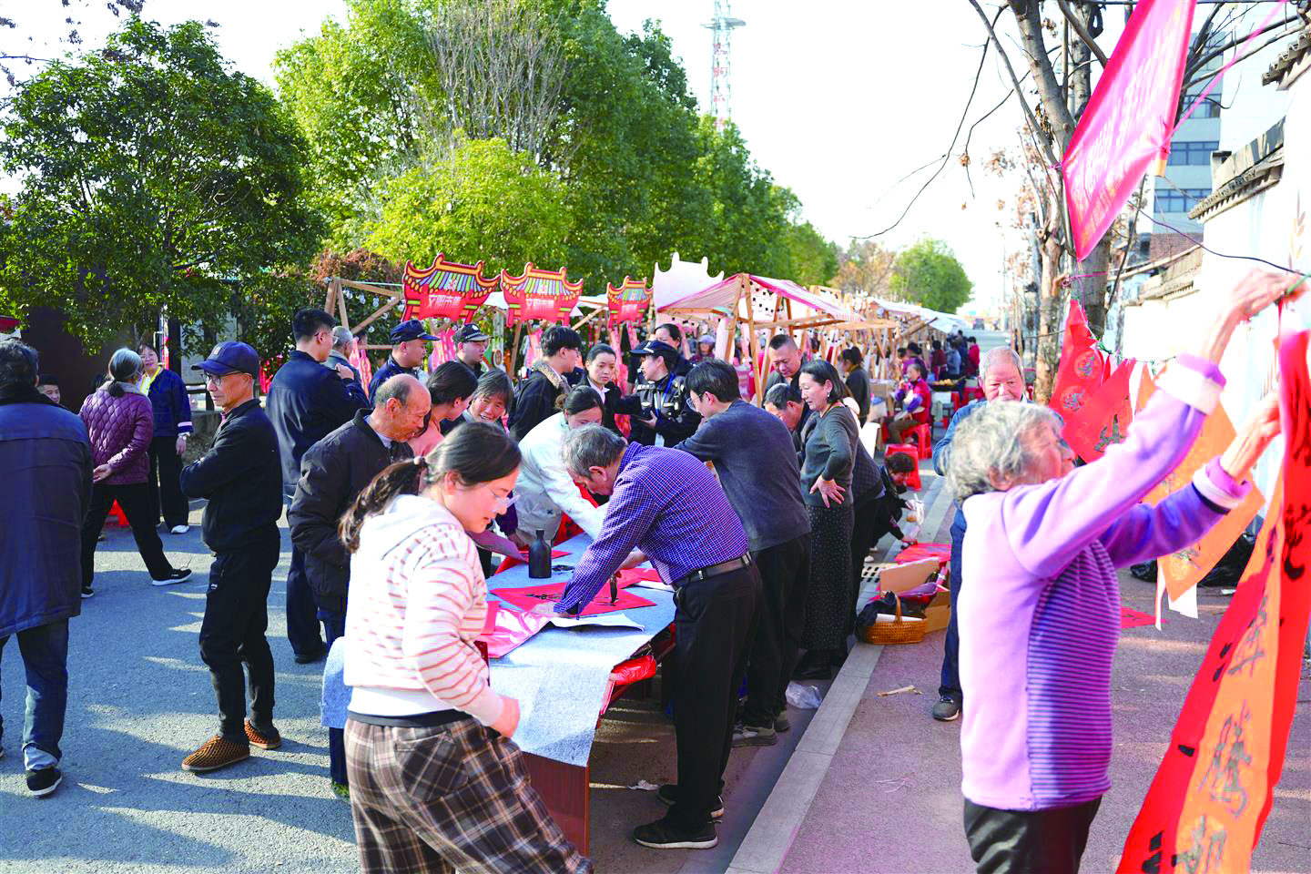 特派员专业力量激活文化活力。村晚三年的跨越式发展,离不开市级文化特派员的持续助力。从最初的偶尔指导,到如今的深度参与,文化特派员们用专业力量,让乡村文化活力持续迸发。近年来,文化特派员们深入基层,从节目编排、队伍建设到非遗传承提供全方位指导。例如文化特派员刘青青挖掘乡村日常素材,编排舞蹈《乡村摄影队》,让村民身边事走上舞台;韩燕为零基础村民量身编排婺剧《三请樊梨花?巡营》,让乡土演员绽放传统风采;胡志飞现场挥毫泼墨,为村民免费书写春联;王潇带来药香砖雕制作体验,让村民感受传统技艺魅力。同时,他们还推动建立区、镇、村三级联动机制,让村民有机会站上更高舞台,同时助力文化礼堂“硬件”“软件”同步提升。