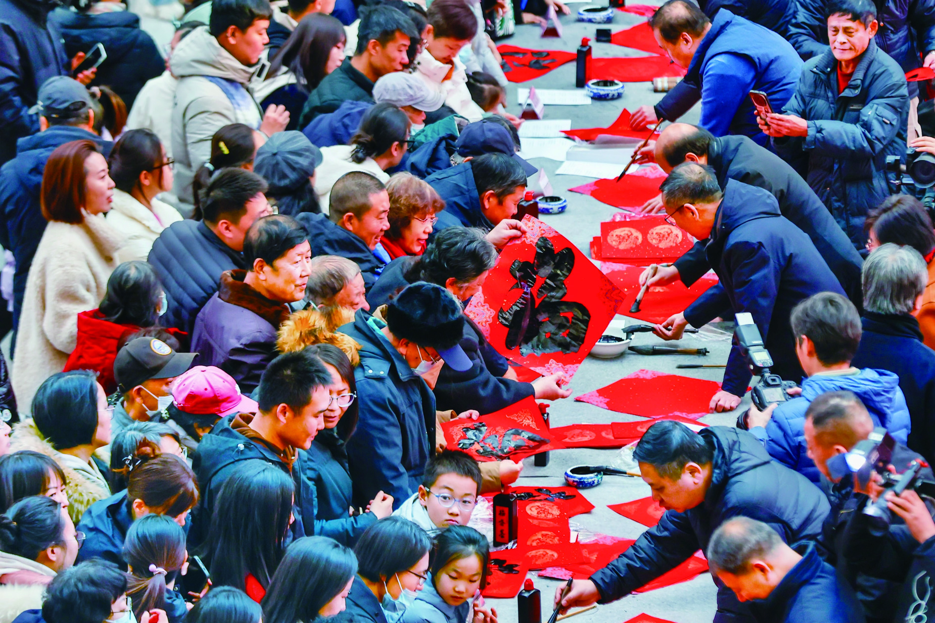 1月22日,文艺工作者在天津市滨海文化中心为市民现场书写春联和“福”字。 春节临近,年味渐浓。各地举办年货大集、写福字春联等活动,人们选购鲜花、中国结等饰物,迎接新春。 新华社发