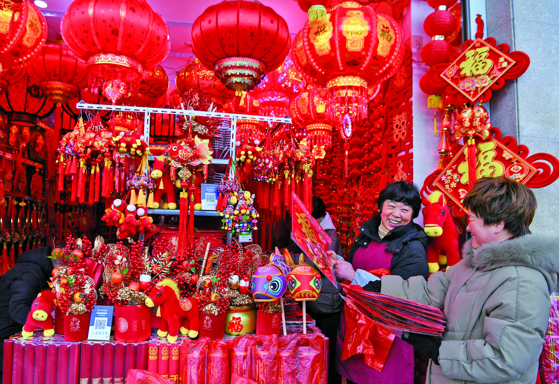 记者 时宽兵 文/摄 昨日,在市区新农贸市场节庆用品商铺里,不少市民在选购春联、中国结、红灯笼、小马玩具等,想把家中打扮得红火喜庆。 随着马年春节临近,我市各地年货市场喜庆气氛日益浓厚。