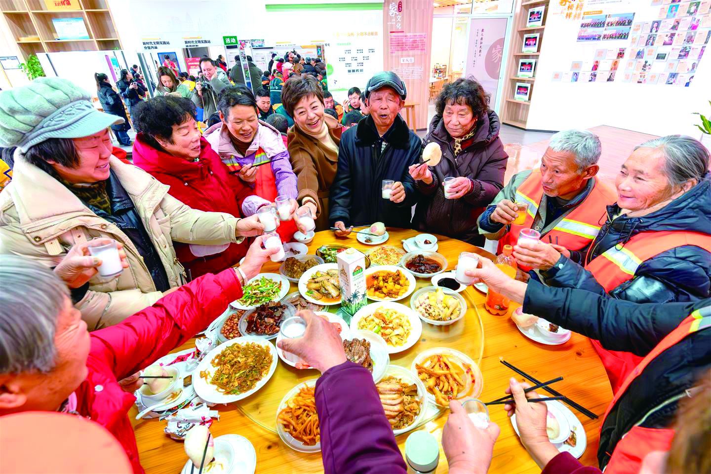 1月23日,金华开发区苏孟乡和悦社区为新就业群体备好三大桌暖心年夜饭,现场同步开展送春联、手机贴膜等便民服务。
