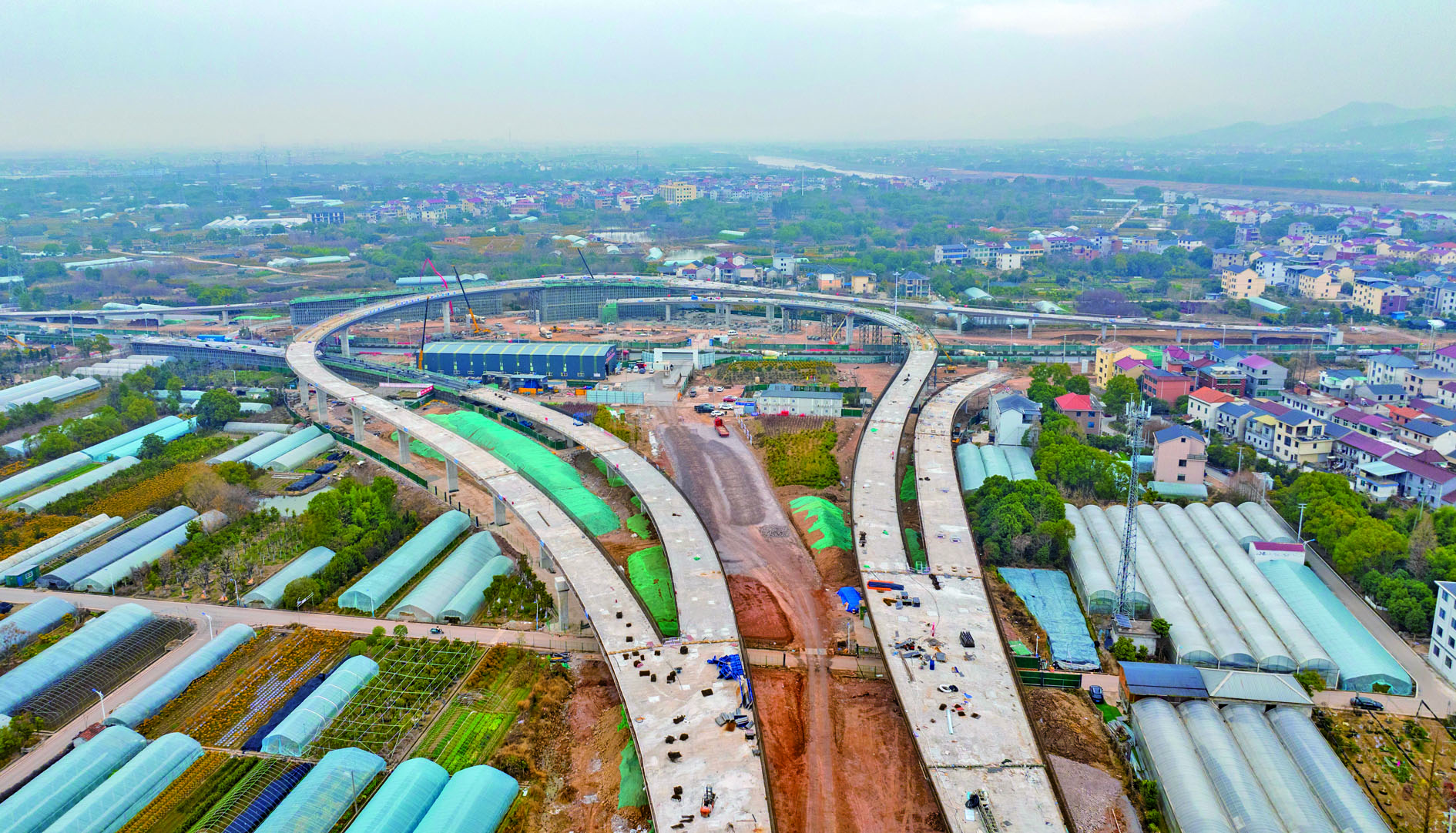 1月27日,金华市金东区华东国际联运港中欧班列集结中心建设项目——港务区枢纽集疏运道路建设工程施工现场正加紧建设。
