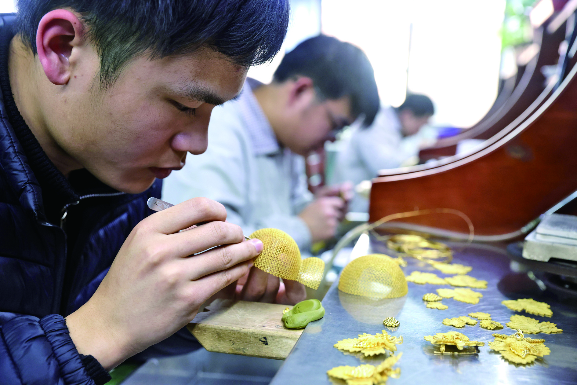 1月28日,员工在位于浙江省杭州市萧山区瓜沥镇的杭州航民百泰首饰有限公司车间加工黄金葫芦摆件。 1月28日,美国纽约商品交易所黄金期货价格突破每盎司5300美元的历史性关口。 新华社发