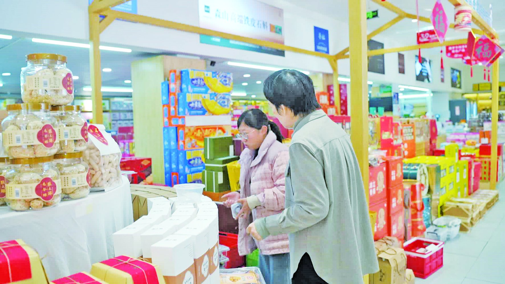 年俗饰品热销、服务行业红火的同时,年宵花市也迎来了第一波销售热潮,承载着浓浓乡情的浦江特产更在年货市场中崭露头角。