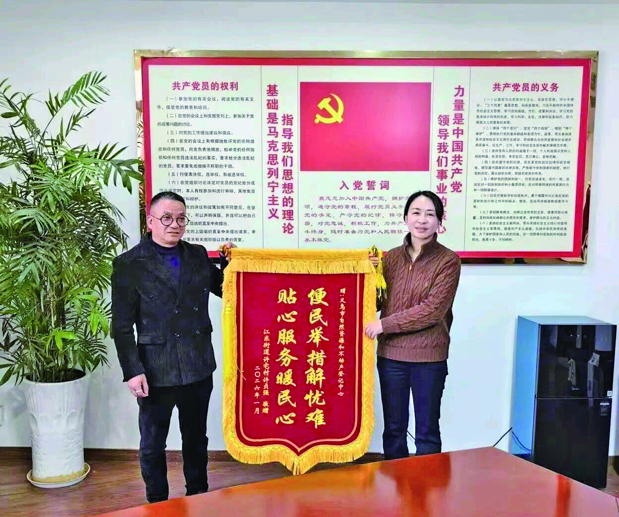 本报消息(记者 王志坚)近日,义乌市自然资源和不动产登记中心收到市民许先生送来的一面写有“便民举措解忧难,贴心服务暖民心”的锦旗。锦旗背后,是一次窗口服务向“家门口”的暖心延伸。