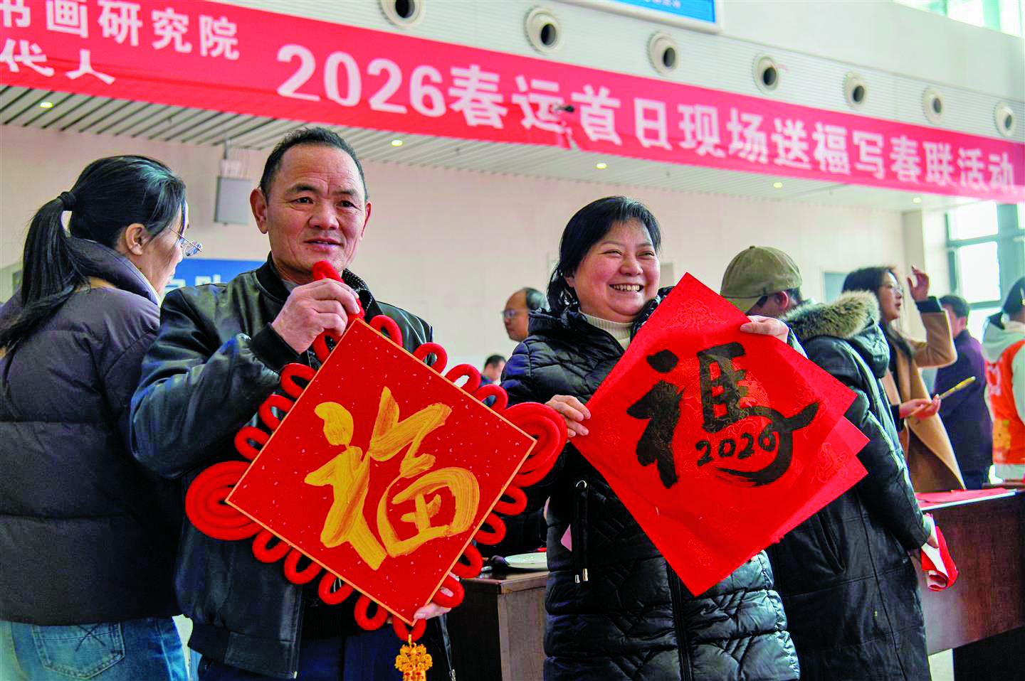昨日,铁路金华站候车大厅里,旅客领取现场书写的“福”字和春联,踏上温暖回家路。