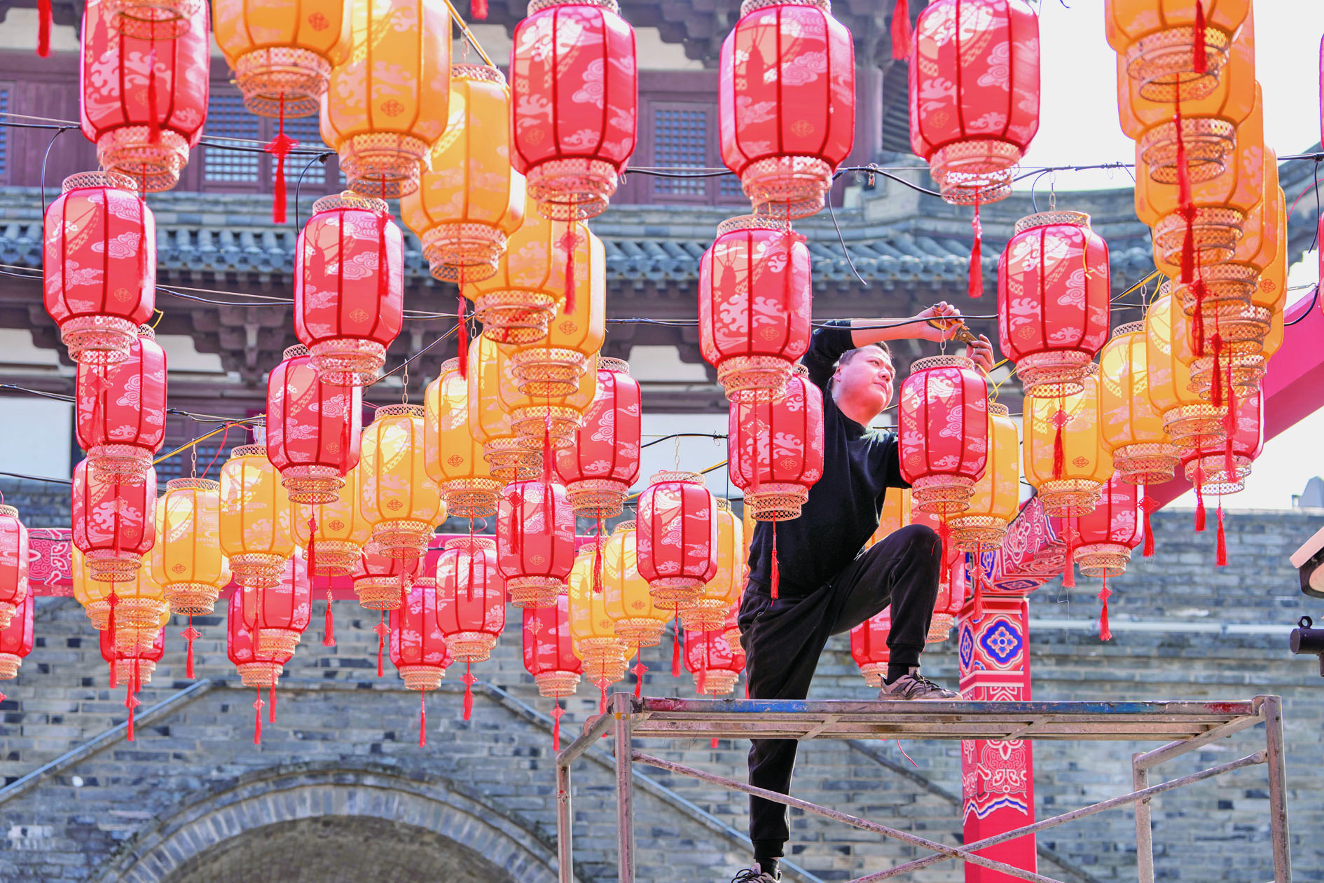 昨日,工人们在婺州古城内悬挂灯笼,为即将到来的新春佳节营造温暖喜庆的节日氛围。