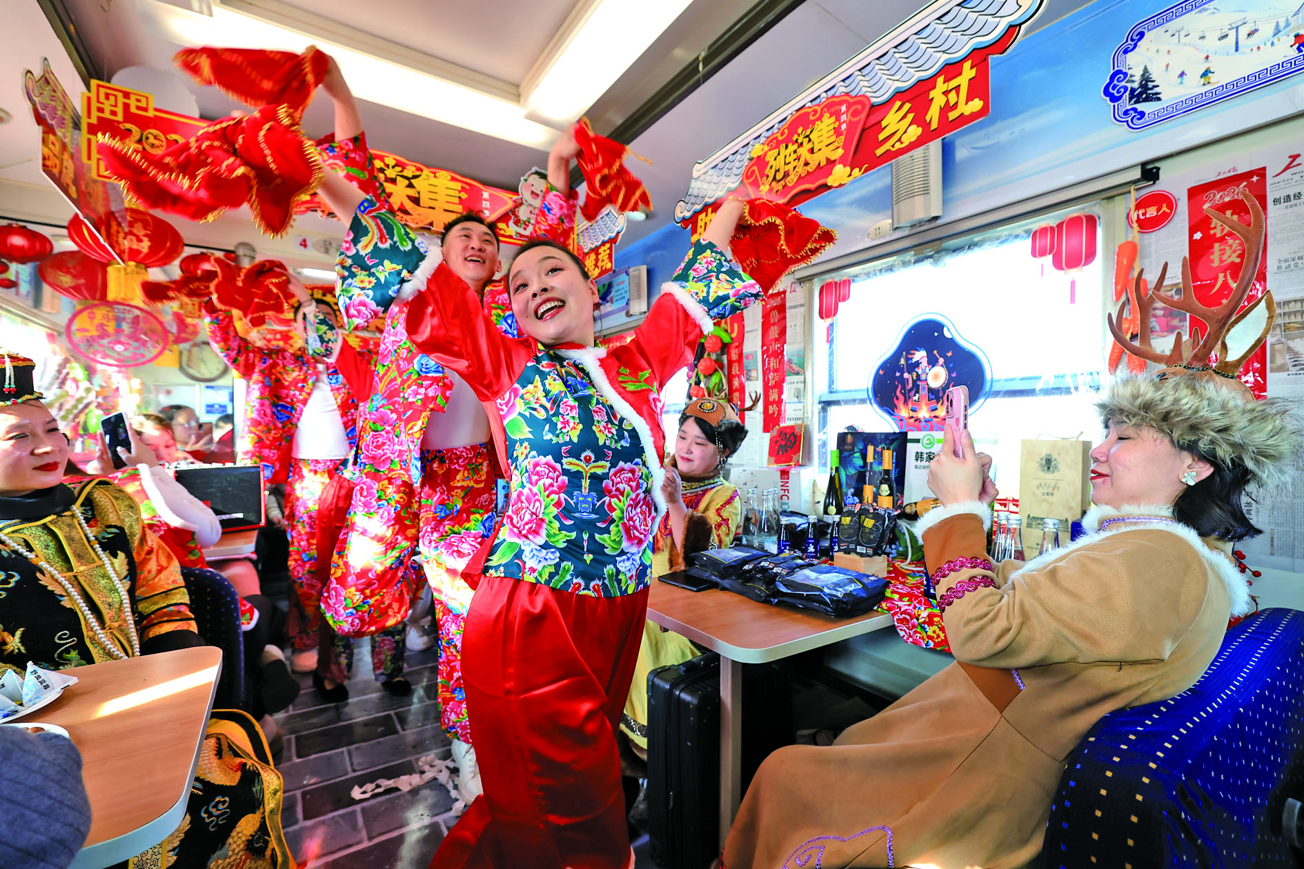 2月4日,在K7103次“列车大集”车厢内,身穿民俗服饰的乘务员为旅客表演。 2月4日,黑龙江2026年首趟“列车大集”K7103次由哈尔滨始发,开往加格达奇。本次“列车大集”车厢悬挂火红灯笼、玉米串、红辣椒等,配以冰雪主题装饰与马年新春对联,营造出浓郁热烈的新年氛围。列车上设置专属展区,涵盖黑龙江省特色农产品以及铁路文创、“非遗”手工艺品等,旅客可现场品尝体验、扫码下单,实现车上体验、快递到家的便捷购物方式。 近年来,中国铁路哈尔滨局集团有限公司陆续推出多趟主题旅游列车,服务地方经济发展。同时为旅客提供独具特色、有温度的春运出行体验。 新华社发
