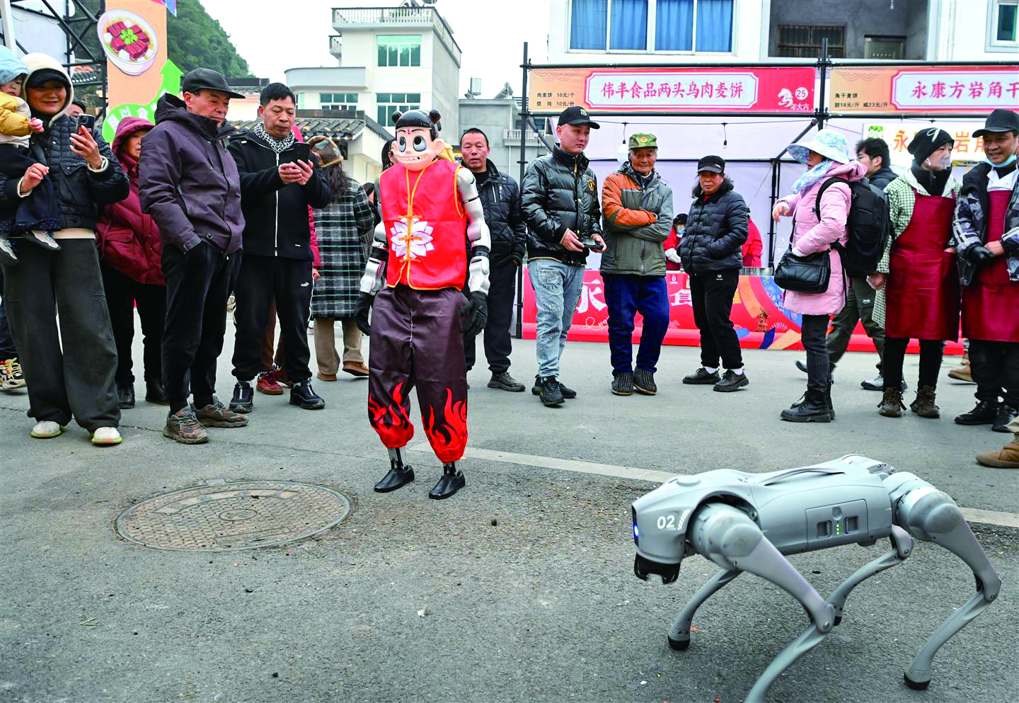 近日,在永康市一些乡镇集市上,人工智能机器人、智能机器狗伴随着欢快的音乐,迈着灵活的步伐,做出跳跃、转圈、握手等一系列高难度动作,憨态可掬的模样引得围观者阵阵欢笑。