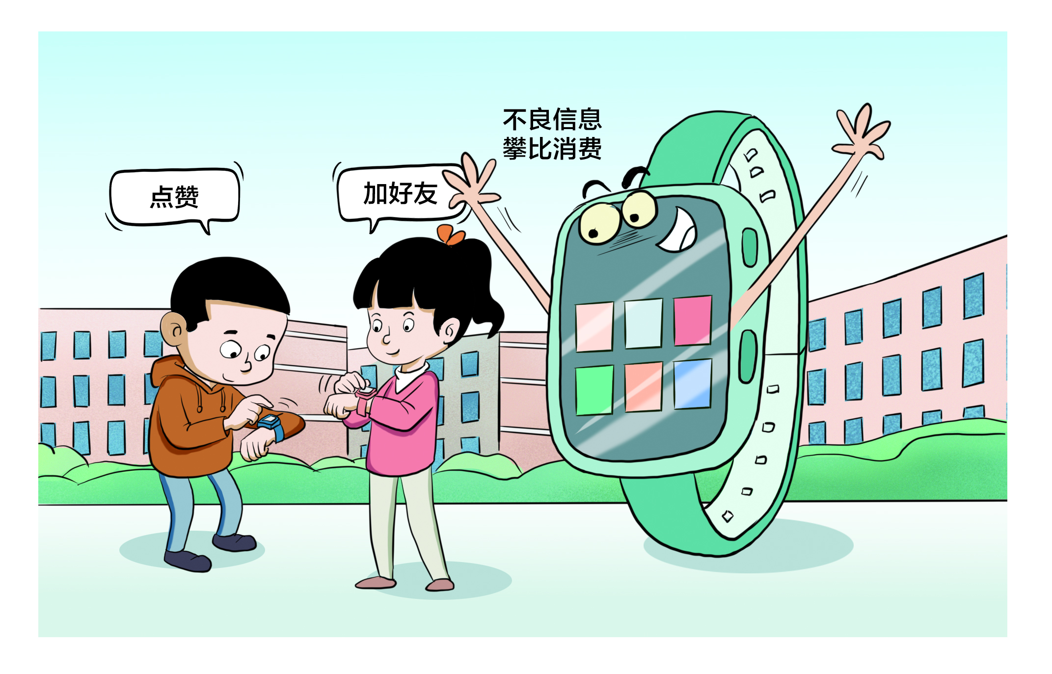 儿童智能手表功能日趋繁杂,出现“手机化”倾向,孩子沉迷其中,虚拟社交、不良信息及攀比消费等隐患凸显。家校需引导孩子合理使用该设备,监管部门更要强化源头治理,让其回归安全保障的初心。 (童俊 图/文)