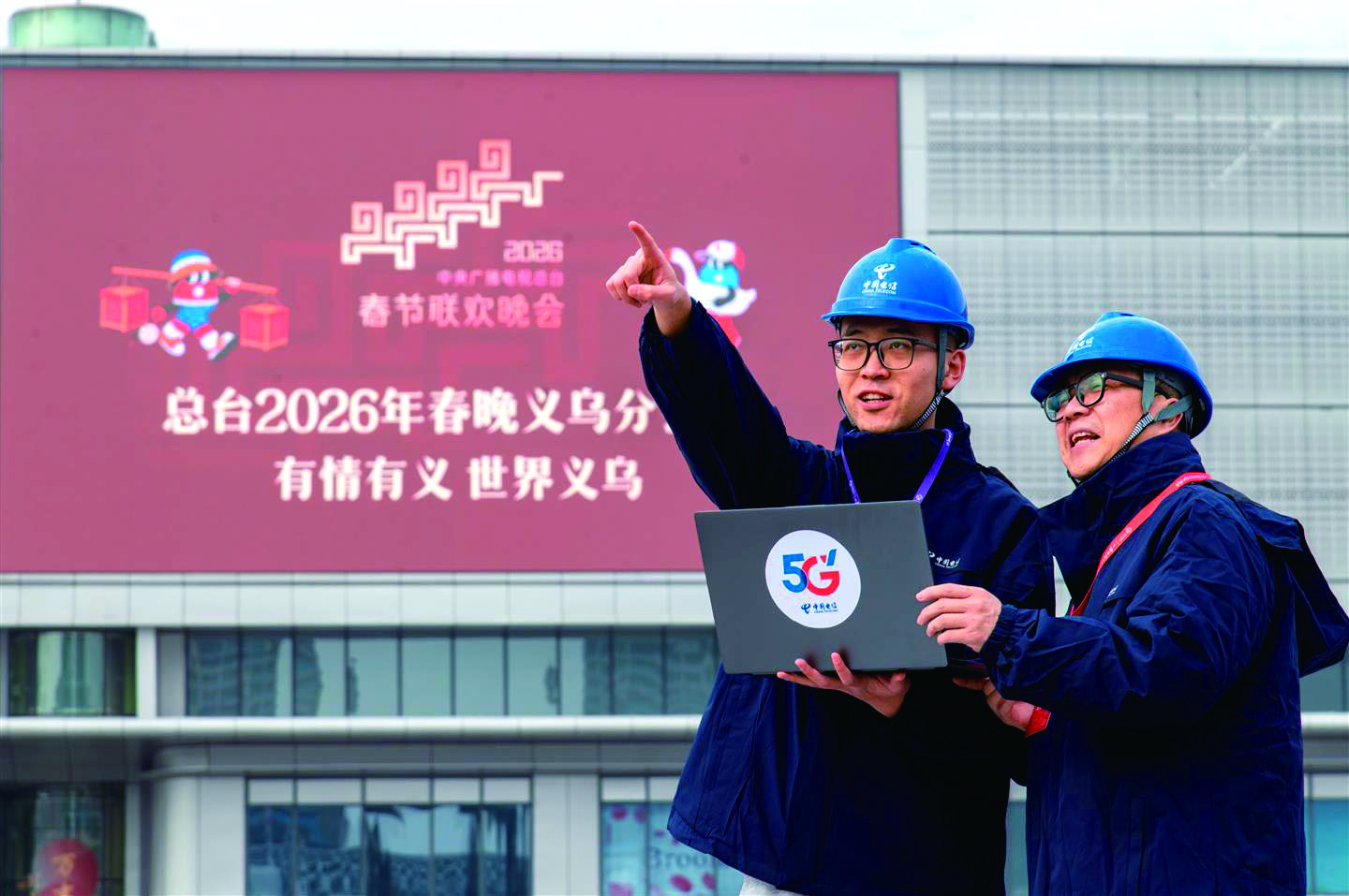 2月4日,在义乌全球数贸中心,中国电信义乌分公司专项保障团队正对春晚相关场所及传输线路进行通信信号巡测与优化,全力护航春晚的网络畅通与视听体验。
