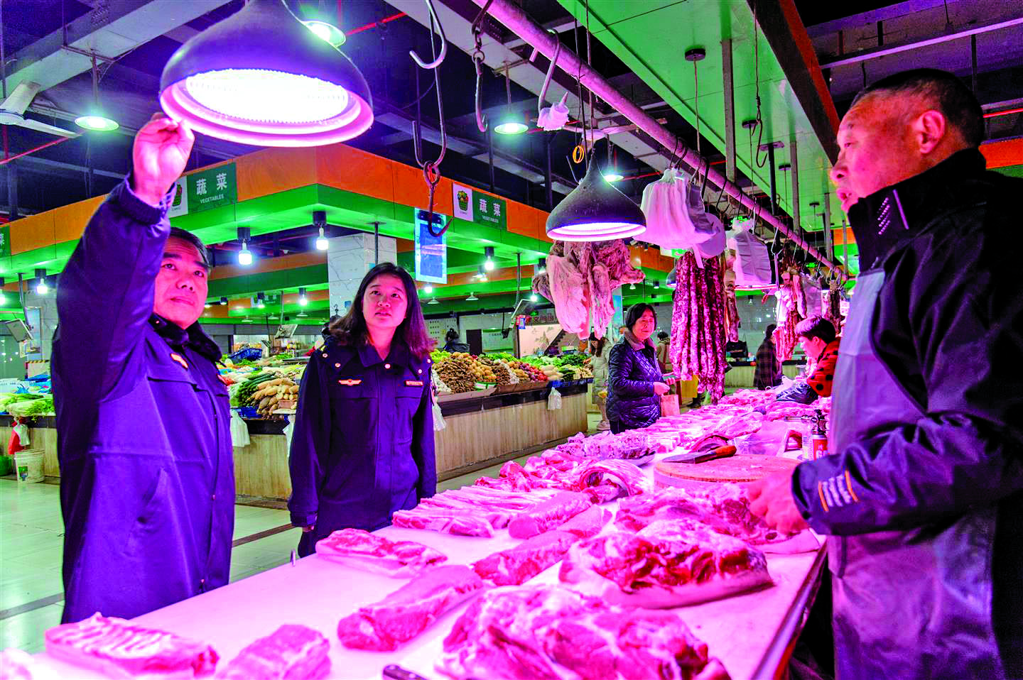 日前,在兰溪市兰江街道排岭农贸市场,当地市场监管人员正在检查肉制品摊位的照明情况。